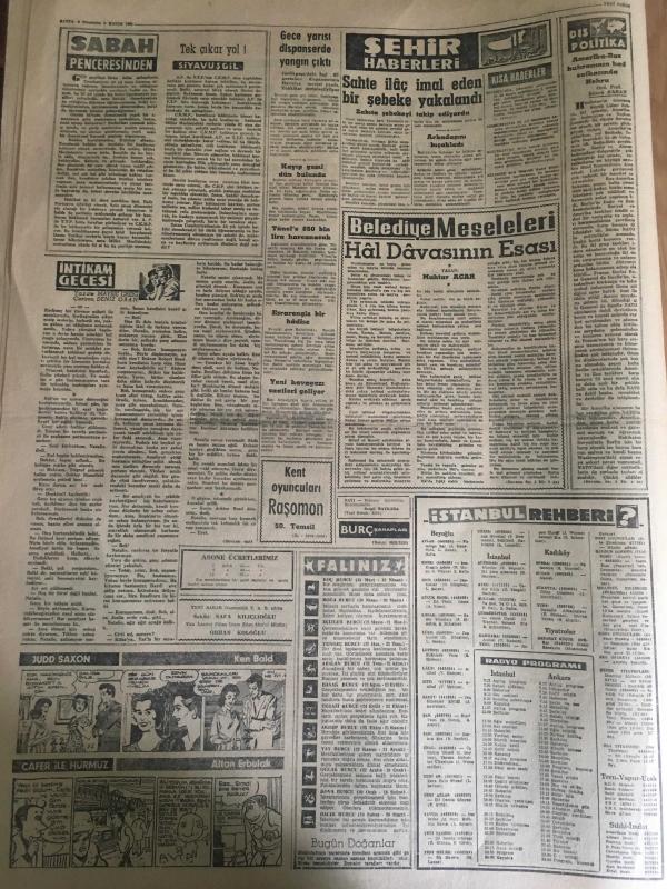 YENİ SABAH GAZETESİ 9 KASIM 1961 YIL :24 SAYI :8139---8 gün :Kabine hala kurulamadı --İnönü Döner kabine kuvvetli olamaz dedi ---İnönü CHP hakkı ne ise onu istiyor ---YTP iyi niyetli olduğunu belirtti ---Öğrencilerin yer meseleleri hallediliyor ---CHP 'nin 147 'lerle ilgili kanun teklifi ----Annesi de Yüksel ' in acısını dayanamadı --CKMP ilk kabineye güven oyu verecek ---Hollywood yangınında zarar 150 milyon lira ---Ayla 'nın babası elleri boş döndü ---Şehir hattı biletlerine zam yapılması düşünülüyor ---Tek çıkar yol :Siyavuşgil --Sahte ilaç imal eden bir şebeke yakalandı ---Atom a karşı sığınak ---İran da bir komünist şebekesi yakalandı --Mahkumlar açlık grevi yapacakmış ---Sinemalar ,Tiyatrolar ,Radyo Programları ---Milli Takım Dün Sadece Gol Attı :7-1---Rus Milli Takımı bugün geliyor ---Teknik Komite Tereddüt Ediyor ---Can maçta sakatlandı ---Kaçalin de Rus forvet hattından şikayetçi --Üç Çocuk Daha Kayboldu ---Eski MBK üyeleri dün toplandı --- adlı eser, Kitap > Süreli Yayınlar > Gazeteler > Türkiye > Genel > Günlük kategorisinde İkinci El olarak satıştadır.