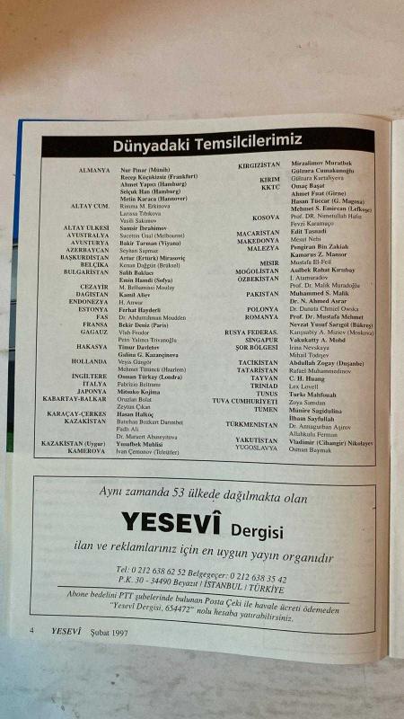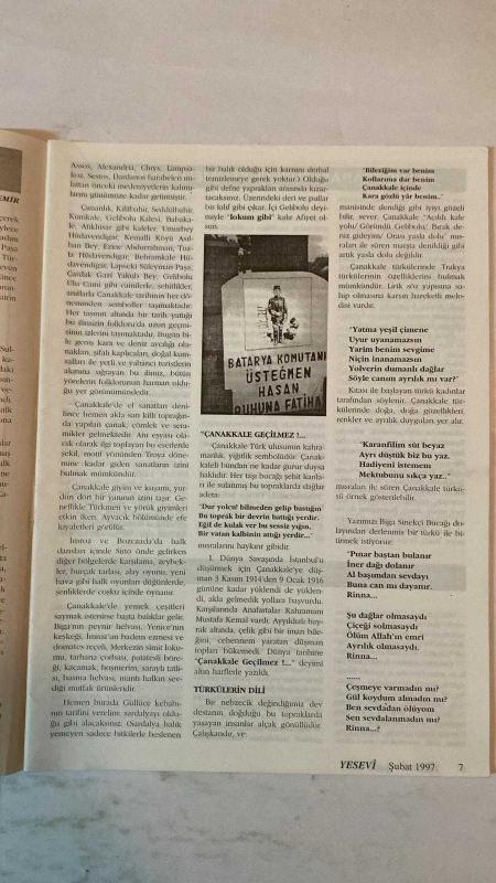 YESEVİ AYLIK SEVGİ DERGİSİ - MART–NİSAN 1997 SAYI: 39–40 ERDOĞAN ASLIYÜCE – METİN AKAR – ARSLAN BULUT – KEMAL ÇAPRAZ – MUHSİN KADIOĞLU – SÜLEYMAN KARATAŞ – VEDAT BİLGİN – ERDİNÇ YAZICI – KUDRET FİKİRLİ – HÜSEYİN DİKİCİ – MEHMET DEMİRTOLA – SELÇUK BESEN – AYDIN EROL – GÖZDE RAMAZANOĞLU – CEM KAYGUSUZ – LOKMAN UZEL – GÂRLÎ AMANMURATOĞLU – AHMET ÖZDEMİR – OSMAN TÜRKAY – CENGİZHAN YURDANUR TÜRK DÜNYASI YESEVİ SEVGİSİYLE 5. DEFA İSTANBUL’DA KUCAKLAŞTI – TÜRK KAHRAMANLIĞININ DESTANLAŞTIĞI BELDE: ÇANAKKALE – NEVRUZ BAYRAMI – ORTA ASYA’DA SSCB BASKISI – DÜNYA KAZAK TÜRKLERİ KURULTAYI – YESEVİ SOFRASI – TÜRK DÜNYASINDAN YESEVİ’YE HEDİYELER – V. TÜRK DÜNYASI KURULTAYI – HAKASYA TÜRK CUMHURİYETİ – İNGİLİZ BELGELERİ – ATAYURTTAN ANAYURTA – ÇOCUK SAYFASI – ÇANAKKALE’NİN COĞRAFİ, TARİHİ VE KÜLTÜREL YAPISI – FOLKLOR, TARIM, BALIKÇILIK VE ÜZÜM YETİŞTİRİCİLİĞİ – DERGİ ABONE VE REKLAM BİLGİLERİ - TAM TAKIM EKSİKSİZ 36 SAYFA adlı eser, Kitap > Süreli Yayınlar > Dergiler > Magazin, Moda kategorisinde İkinci El olarak satıştadır.