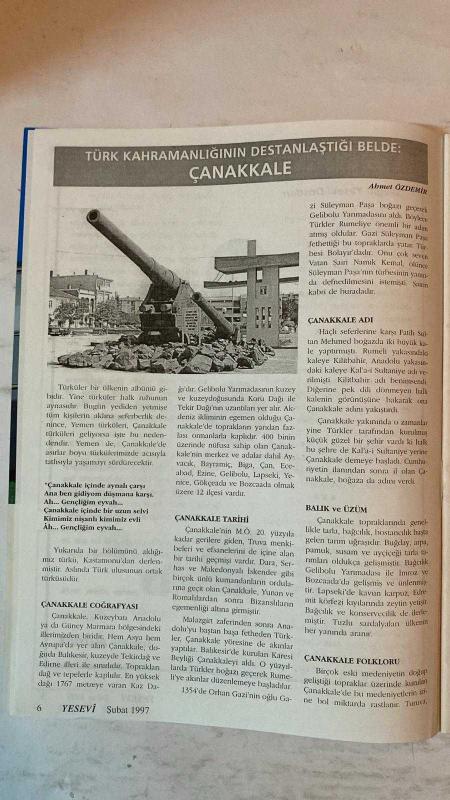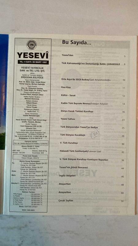 YESEVİ AYLIK SEVGİ DERGİSİ - MART–NİSAN 1997 SAYI: 39–40 ERDOĞAN ASLIYÜCE – METİN AKAR – ARSLAN BULUT – KEMAL ÇAPRAZ – MUHSİN KADIOĞLU – SÜLEYMAN KARATAŞ – VEDAT BİLGİN – ERDİNÇ YAZICI – KUDRET FİKİRLİ – HÜSEYİN DİKİCİ – MEHMET DEMİRTOLA – SELÇUK BESEN – AYDIN EROL – GÖZDE RAMAZANOĞLU – CEM KAYGUSUZ – LOKMAN UZEL – GÂRLÎ AMANMURATOĞLU – AHMET ÖZDEMİR – OSMAN TÜRKAY – CENGİZHAN YURDANUR TÜRK DÜNYASI YESEVİ SEVGİSİYLE 5. DEFA İSTANBUL’DA KUCAKLAŞTI – TÜRK KAHRAMANLIĞININ DESTANLAŞTIĞI BELDE: ÇANAKKALE – NEVRUZ BAYRAMI – ORTA ASYA’DA SSCB BASKISI – DÜNYA KAZAK TÜRKLERİ KURULTAYI – YESEVİ SOFRASI – TÜRK DÜNYASINDAN YESEVİ’YE HEDİYELER – V. TÜRK DÜNYASI KURULTAYI – HAKASYA TÜRK CUMHURİYETİ – İNGİLİZ BELGELERİ – ATAYURTTAN ANAYURTA – ÇOCUK SAYFASI – ÇANAKKALE’NİN COĞRAFİ, TARİHİ VE KÜLTÜREL YAPISI – FOLKLOR, TARIM, BALIKÇILIK VE ÜZÜM YETİŞTİRİCİLİĞİ – DERGİ ABONE VE REKLAM BİLGİLERİ - TAM TAKIM EKSİKSİZ 36 SAYFA, ERDOĞAN ASLIYÜCE tarafından kaleme alınmıştır. YESEVİ AYLIK SEVGİ DERGİSİ - MART–NİSAN 1997 SAYI: 39–40 ERDOĞAN ASLIYÜCE – METİN AKAR – ARSLAN BULUT – KEMAL ÇAPRAZ – MUHSİN KADIOĞLU – SÜLEYMAN KARATAŞ – VEDAT BİLGİN – ERDİNÇ YAZICI – KUDRET FİKİRLİ – HÜSEYİN DİKİCİ – MEHMET DEMİRTOLA – SELÇUK BESEN – AYDIN EROL – GÖZDE RAMAZANOĞLU – CEM KAYGUSUZ – LOKMAN UZEL – GÂRLÎ AMANMURATOĞLU – AHMET ÖZDEMİR – OSMAN TÜRKAY – CENGİZHAN YURDANUR TÜRK DÜNYASI YESEVİ SEVGİSİYLE 5. DEFA İSTANBUL’DA KUCAKLAŞTI – TÜRK KAHRAMANLIĞININ DESTANLAŞTIĞI BELDE: ÇANAKKALE – NEVRUZ BAYRAMI – ORTA ASYA’DA SSCB BASKISI – DÜNYA KAZAK TÜRKLERİ KURULTAYI – YESEVİ SOFRASI – TÜRK DÜNYASINDAN YESEVİ’YE HEDİYELER – V. TÜRK DÜNYASI KURULTAYI – HAKASYA TÜRK CUMHURİYETİ – İNGİLİZ BELGELERİ – ATAYURTTAN ANAYURTA – ÇOCUK SAYFASI – ÇANAKKALE’NİN COĞRAFİ, TARİHİ VE KÜLTÜREL YAPISI – FOLKLOR, TARIM, BALIKÇILIK VE ÜZÜM YETİŞTİRİCİLİĞİ – DERGİ ABONE VE REKLAM BİLGİLERİ - TAM TAKIM EKSİKSİZ 36 SAYFA adlı eser Türkçe dilindedir.