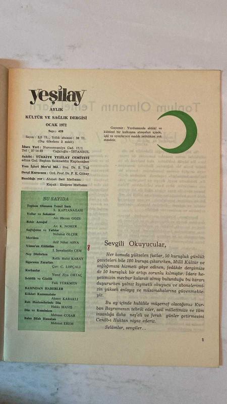 YEŞİLAY AYLIK KÜLTÜR VE SAĞLIK DERGİSİ - OCAK 1972 — SAYI: 458 SELAHADDİN KAPTANAĞASI - DOÇ. DR. S. TUĞ - ORD. PROF. DR. F. K. GÖKAY - HİCRAN GÖZE - K. NOMER - BEKİR ARIOĞUL - NEBAHAT ÖLÇER - ARİF NİHAT ASYA - SEMAHADDİN CEM - REFİK HALİD KARAY - C. LOFÇALI - YUSUF ZİYA ORTAÇ - FAİK TÜRKMEN - AHMET KABAKLI - HAKKI MAVİŞ - MEHMET COŞAR - MEHMET EREM TOPLUM OLMANIN TEMEL ŞARTI - YOLLAR VE SOKAKLAR - SAĞLIĞIMIZ VE TATLILAR - MEVLÂNA - YUNUS’UN GÜLİSTANI - NEY DİNLERKEN - SİGARANIN ZARARLARI - KURBANLAR - ŞEHİTLİK VE GAZİLİK - KÖKLERİ KAZINMALIDIR - ÇOCUKLAR ÖNCE ANNE BABALARINI TAKLİT EDER - ROL MODELİN EĞİTİMDEKİ YERİ - ŞİDDETLİ RÜZGÂRIN PİLATES ETKİSİ - 20 YAŞ DİŞLERİ HAKKINDA BİLİNMESİ GEREKENLER - OSMANLI MUTFAĞINDAN TARİFLER - BATI HASTANELERİNDE DİN - DİN VE KOMÜNİZM - BALIN ŞİFALI HASSALARI - TAM TAKIM EKSİKSİZ 32 SAYFA, SELAHADDİN KAPTANAĞASI tarafından kaleme alınmıştır. Eser DR. S. TUĞ editörlüğünde hazırlanmıştır. YEŞİLAY AYLIK KÜLTÜR VE SAĞLIK DERGİSİ - OCAK 1972 — SAYI: 458 SELAHADDİN KAPTANAĞASI - DOÇ. DR. S. TUĞ - ORD. PROF. DR. F. K. GÖKAY - HİCRAN GÖZE - K. NOMER - BEKİR ARIOĞUL - NEBAHAT ÖLÇER - ARİF NİHAT ASYA - SEMAHADDİN CEM - REFİK HALİD KARAY - C. LOFÇALI - YUSUF ZİYA ORTAÇ - FAİK TÜRKMEN - AHMET KABAKLI - HAKKI MAVİŞ - MEHMET COŞAR - MEHMET EREM TOPLUM OLMANIN TEMEL ŞARTI - YOLLAR VE SOKAKLAR - SAĞLIĞIMIZ VE TATLILAR - MEVLÂNA - YUNUS’UN GÜLİSTANI - NEY DİNLERKEN - SİGARANIN ZARARLARI - KURBANLAR - ŞEHİTLİK VE GAZİLİK - KÖKLERİ KAZINMALIDIR - ÇOCUKLAR ÖNCE ANNE BABALARINI TAKLİT EDER - ROL MODELİN EĞİTİMDEKİ YERİ - ŞİDDETLİ RÜZGÂRIN PİLATES ETKİSİ - 20 YAŞ DİŞLERİ HAKKINDA BİLİNMESİ GEREKENLER - OSMANLI MUTFAĞINDAN TARİFLER - BATI HASTANELERİNDE DİN - DİN VE KOMÜNİZM - BALIN ŞİFALI HASSALARI - TAM TAKIM EKSİKSİZ 32 SAYFA adlı eser Türkçe dilindedir.