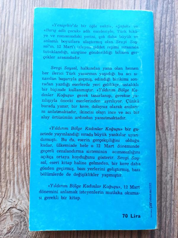 YILDIRIM BÖLGE KADINLAR KOĞUŞU, SEVGİ SOYSAL tarafından kaleme alınmıştır. Kitap 1979 yılında Bilgi Yayınevi tarafından [Ankara] yayınlanmıştır. Satışta olan kitap, yayınevinin 4. baskısıdır. 256 sayfadır. YILDIRIM BÖLGE KADINLAR KOĞUŞU adlı eser Türkçe dilindedir.