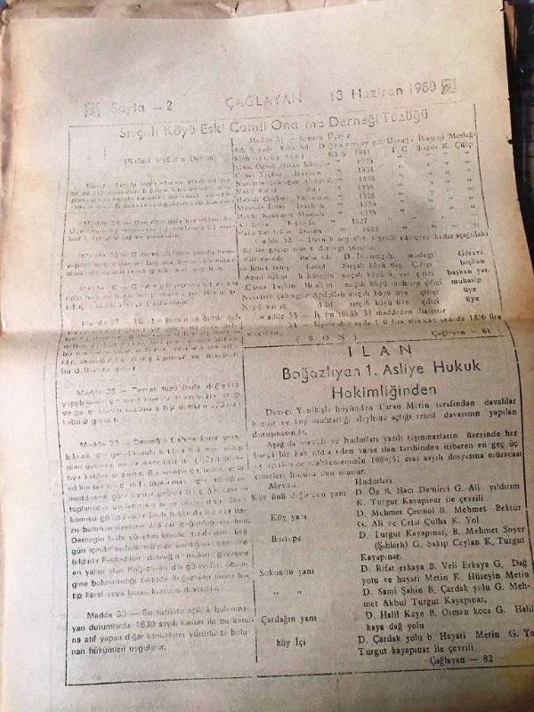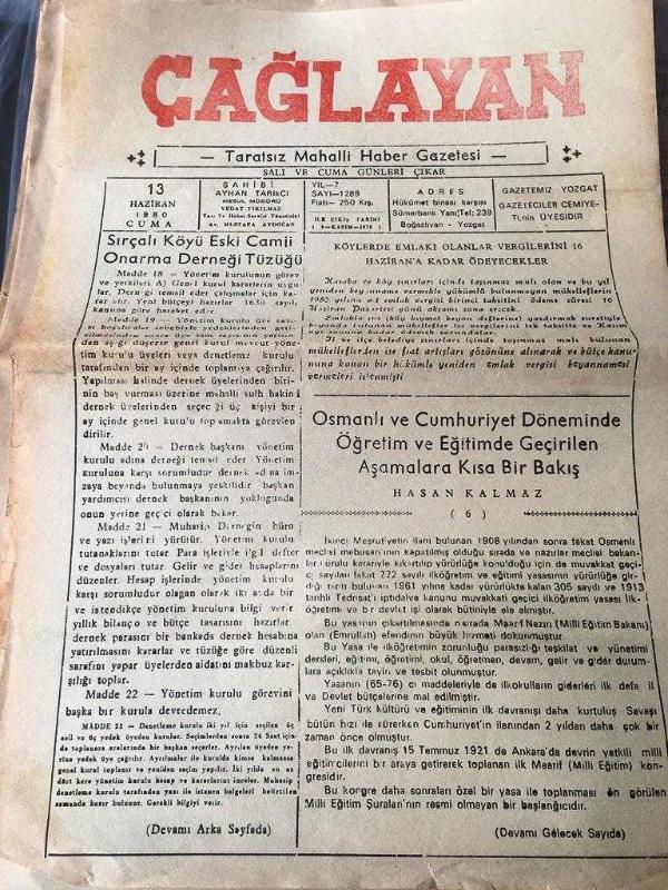 YOZGAT ÇAĞLAYAN GAZETESİ - Tarafsız Mahalli Haber Gazetesi -Yerel Taşra Basını - 13 HAZİRAN 1980-YIL :7 Sayı :1289-Sırça Köyü Eski Cami Onarma Derneği Tüzüğü-Köylerde Emlakçı Olanlar Vergilerin 16 Haziran'a Kadar Ödeyecekler-Osmanlı Ve Cumhuriyet Döneminde Öğretim Ve Eğitimde Geçirilen Aşamalara Kısa Bir Bakış -İlan Boğazlıyan 1. Asliye Hukuk Hakimliğinden - Yıpranma, sararmalar, kupon kesiği ve yırtılmalar zamana bağlı olarak görülebilir.