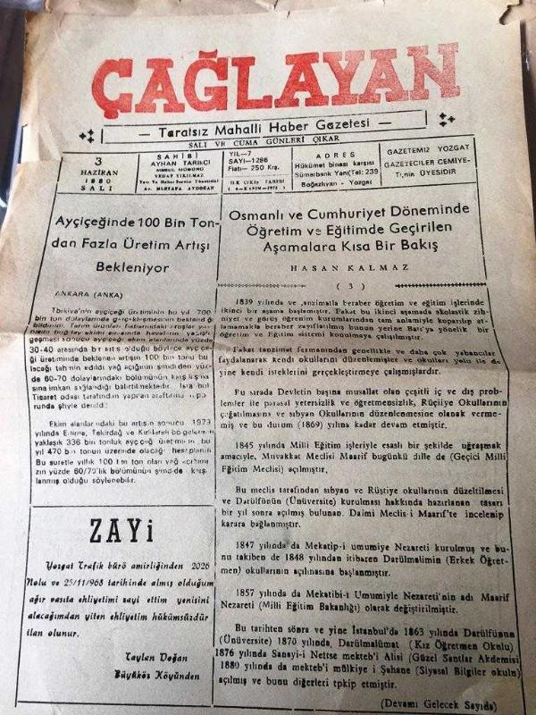 YOZGAT ÇAĞLAYAN GAZETESİ - Tarafsız Mahalli Haber Gazetesi -Yerel Taşra Basını -3 Haziran 1980-Yıl 7 -Sayı 1286-Ayçiçeğinde 100 bin Tondan Fazla Üretim Artışı Bekleniyor- Zayi Taylan Doğan -Osmanlı Ve Cumhuriyet Döneminde Öğretim Ve Geçirilen Aşamalara Kısa Bir Bakış - Hasan Kalmaz-Lüzumlu Telefonlar İlan Tarifesi -Yerli Petrol Üretimini Artırmak İçin 38 Sondaj Kulesinin Faaliyete Geçeceği Açıklandı - Yıpranma, sararmalar, kupon kesiği ve yırtılmalar zamana bağlı olarak görülebilir.