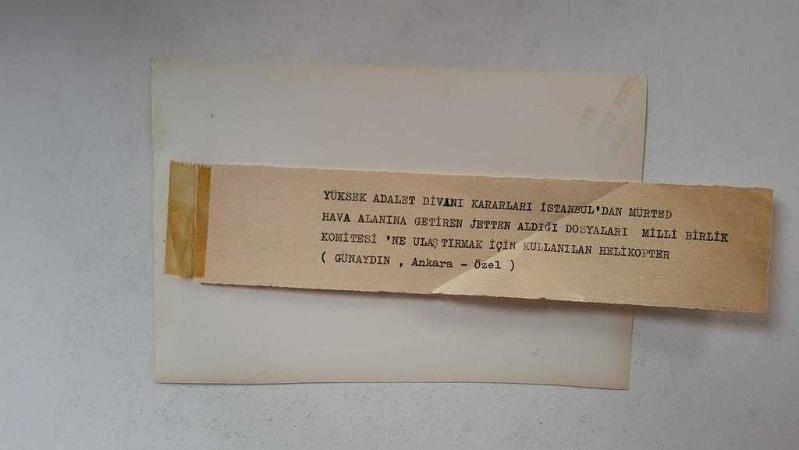 YÜKSEK ADALET DİVANI KAEARLARI İSTANBUL'DAN MÜRTED HAVA ALANINA GETİREN JETTEN ALDIĞI DOSYALARI MİLLİ BİRLİK KOMİTESİ'NE ULAŞTIRMAK İÇİN KULLANILAN HELİKOPTERİN ORİJİNALFOTOĞRAFI - 18 x 12 cm EBADINDA başlıklı ürün, Efemera, Müzik, Sinema > Fotoğraflar > Diğer kategorisi altında İkinci El olarak satılmaktadır.