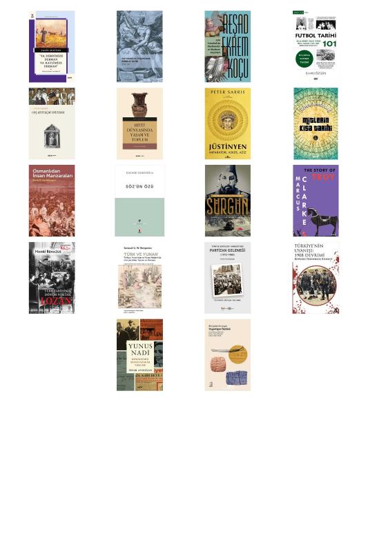 ''Ya Derdimize Derman Ya Katlimize Ferman'' - Astronomi ve Coğrafyanın Kültürel Tarihi - Eski İstanbul’da Meyhaneler ve Meyhane Köçekleri - Futbol Tarihi 101 - Geç Antikçağ Dünyası - Hitit Dünyasında Yaşam ve Toplum - Jüstinyen - Mitlerin Kısa Tarihi - Osmanlıdan İnsan Manzaraları - Söz'ün Özü - Sürgün - The Story Of Troy - Türk Tarihinin Dönüm Noktası Lozan - Türk ve Yunan - Türkiye Sosyalist Hareketinde Partizan Geleneği - Türkiye’nin Uyanışı - 1908 Devrimi - Yunus Nadi - İlk Çağ’dan Orta Çağ’a Uygarlığın Öyküsü