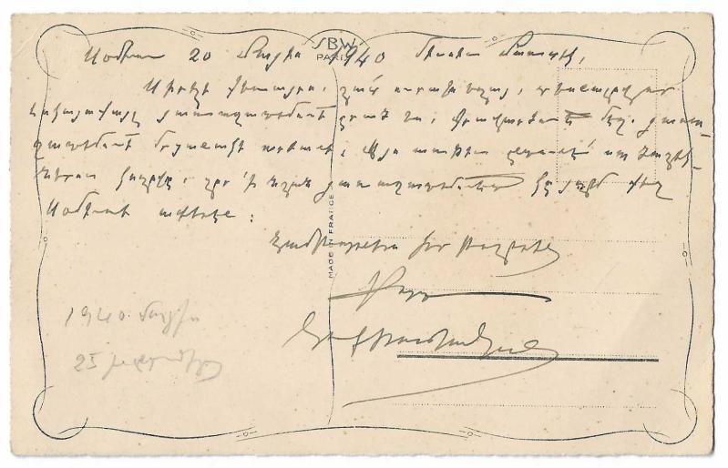 Yabancı kartpostal, arka yüzü Ermenice yazılı, 1940 tarihli