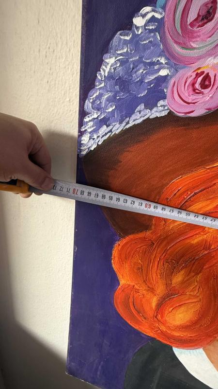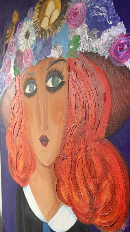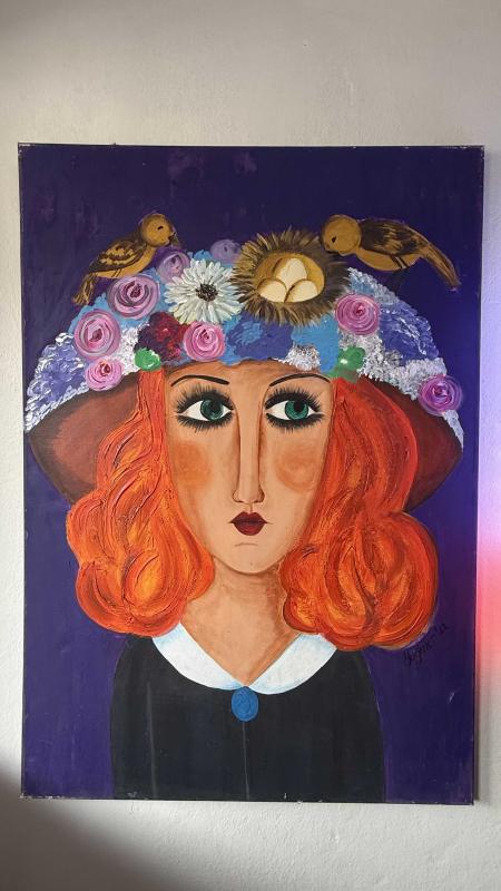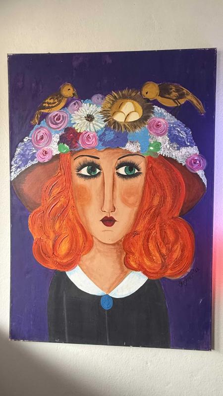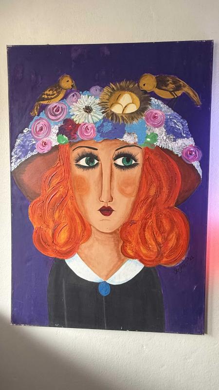 Orijinal bir sanat eseri olan bu tablo, stilize edilmiş bir kadın portresini ve şapkasındaki detayları içerir. Tablo, duvar dekorasyonu için uygundur ve sanatsal bir dokunuş sunar. Yağlı boya sanatçı imzalı devasa boyda