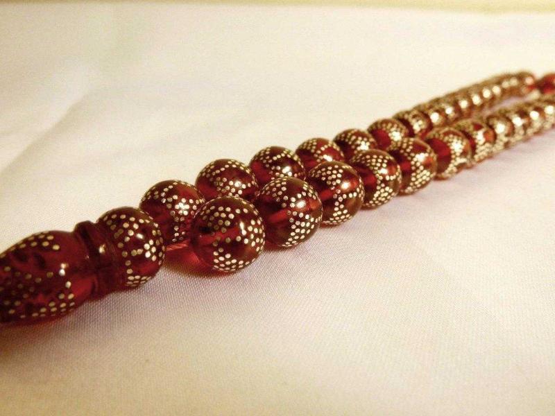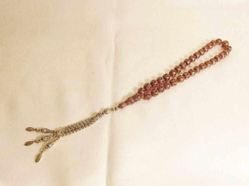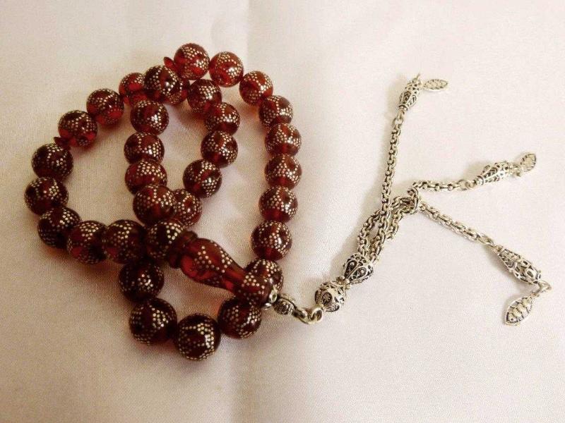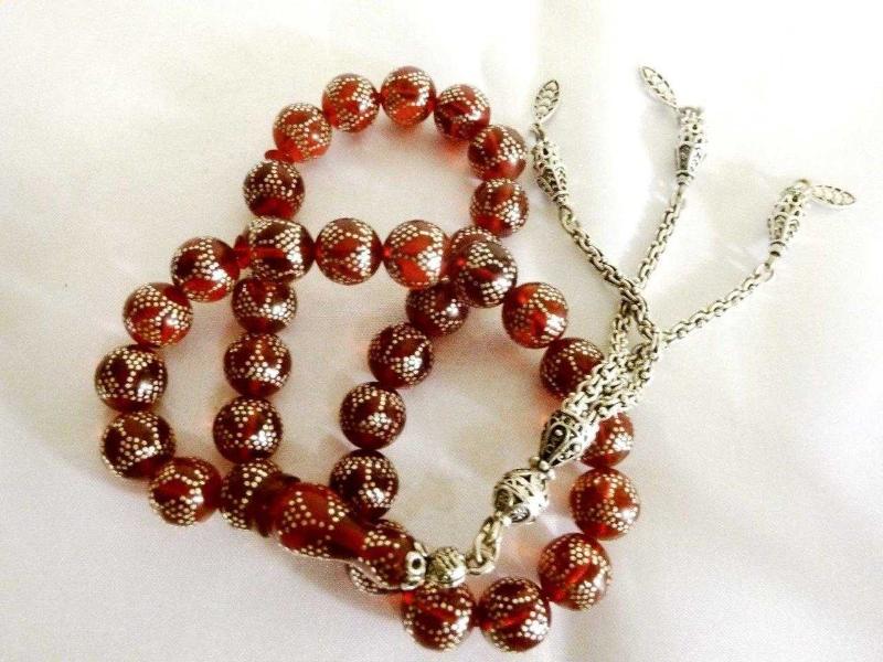 Yakut rengi ateş kehribar, Erzurum usta işi, gümüş kakmalı, gümüş püsküllü 33'lük tesbih. Püskül dahil boy: 34cm., 9 ay önce kitantik’te satışa sunulmuştur.