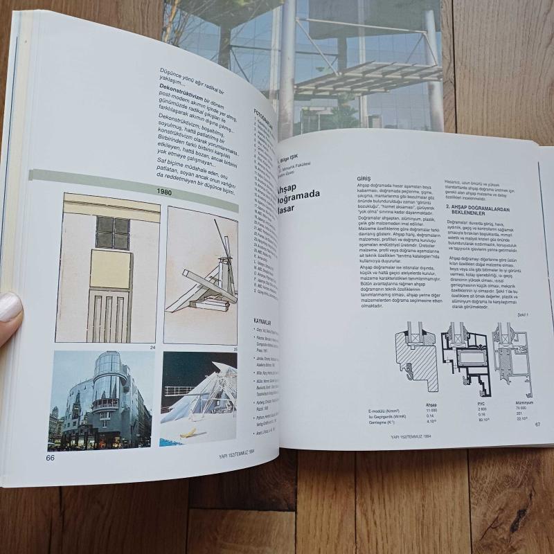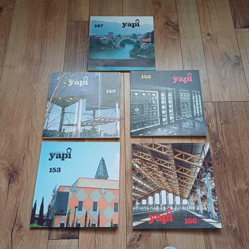 147,149,152,153 ve 156 inci sayilar. 1994 yili, Şubat,Nisan,Temmuz,Agustos ve Kasim aylari. Her sayi yaklasik 90 sayfadan olusuyor. Genel konu başliklari; Dr.Amir PASIC, Bosna'daki Mimari Yapilar Sabancı Center,Projeleri,Teknik Bilgileri(39 katli Akbank Binasi) Alvar Aalto Cizimleri Huseyin Pariltan Resimleri Yapi Elemani olarak Pencere incelemeleri Waterloo Uluslararasi Terminali,Londra Manş Tuneli