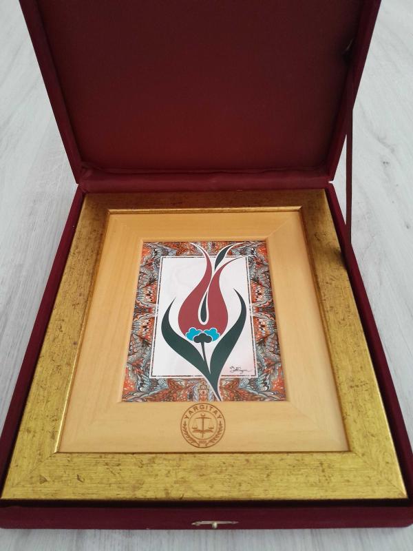 Yargıtay Ahşap Çerçeveli Kadife Kutulu Elişi Ebru Sanatı Çini Duvar Tablosu Porselen başlıklı antika/koleksiyon objesi Türkiye menşe’lidir. 2000 ve sonrası dönemine aittir.