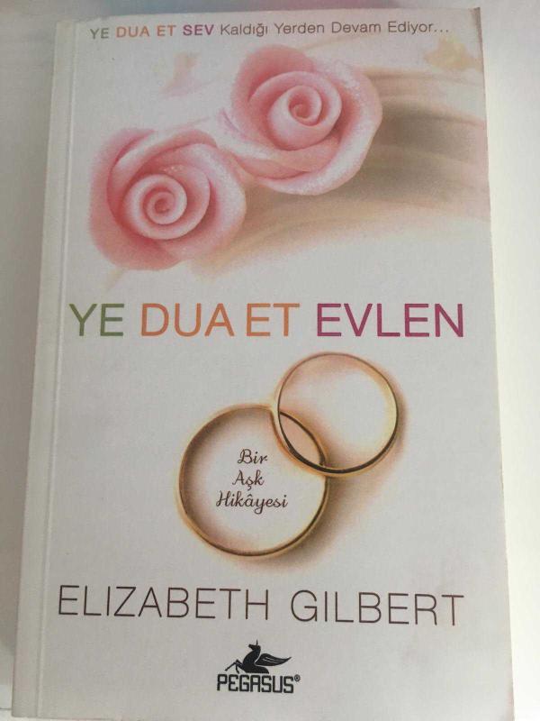 Ye Dua Et Evlen, Elizabeth Gilbert tarafından kaleme alınmıştır. Kitap Pegasus Yayınları tarafından 978-605-4263-57-8 ISBN kodu ile yayınlanmıştır. Bu baskının çevirisi Çiğdem Samsunlu tarafından yapılmıştır. 343 sayfadır. Ye Dua Et Evlen adlı eser Türkçe dilindedir.