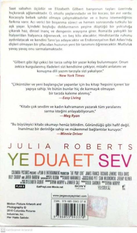 Ye Dua Et Sev(Cep Boy), Elızabeth Gılbert tarafından kaleme alınmıştır. Kitap 2010 yılında Pegasus Yayıncılık tarafından yayınlanmıştır. 500 sayfadır. Ye Dua Et Sev(Cep Boy) adlı eser Türkçe dilindedir.