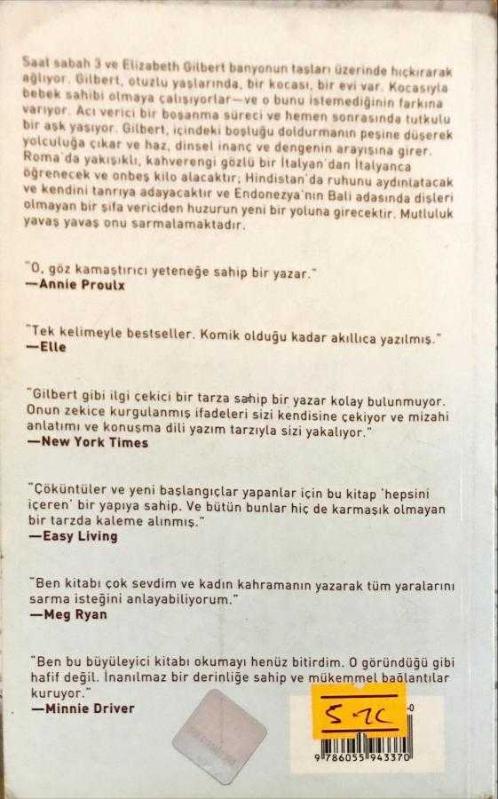 Ye Dua Et Sev ( cep boy ), Elizabeth Gilbert tarafından kaleme alınmıştır. Kitap 2008 yılında Pegasus Yayıncılık tarafından yayınlanmıştır. 480 sayfadır. Ye Dua Et Sev ( cep boy ) adlı eser Türkçe dilindedir.