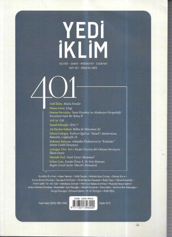 Kitap 2023 yılında yayınlanmıştır. 1 sayfadır. Sayfa bilgisi 3. hamur olarak belirtilmiştir. Yedi İklim Dergisi sayı: 401 adlı eser Türkçe dilindedir.