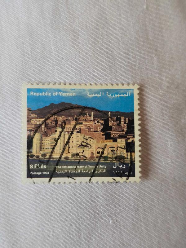 Yemen Cumhuriyeti'nin 4. Birlik Yıldönümü'nü anmak için basılmış bir puldur. Pulda genellikle Eski Sana'a gibi Yemen'in tarihi bir şehrinin manzarası yer alır. Ülke Yemen Cumhuriyeti (Republic of Yemen / الجمهورية اليمنية) Değer (Nominal) 8 Fils (Arapça: ٨ فلوس) Emisyon Yılı 1994 (Postage 1994 / ١٩٩٤) Konu Yemen Birliği'nin 4. Yıldönümü (The 4th anniversary of Yemen Unity / الذكرى الرابعة للوحدة اليمنية) En olası emisyon yılları, 1982-1997 arasındaki dönemdir. Pulların tam baskı serisini (örneğin 1982-1986 "Machin" serisi veya 1992-1997 serisi) belirlemek için su lekesi (watermark) veya baskı ayrıntıları gibi daha fazla detaya ihtiyaç duyulur, ancak genel olarak 1980'lerin sonu ve 1990'ların başı serilerine aittirler.