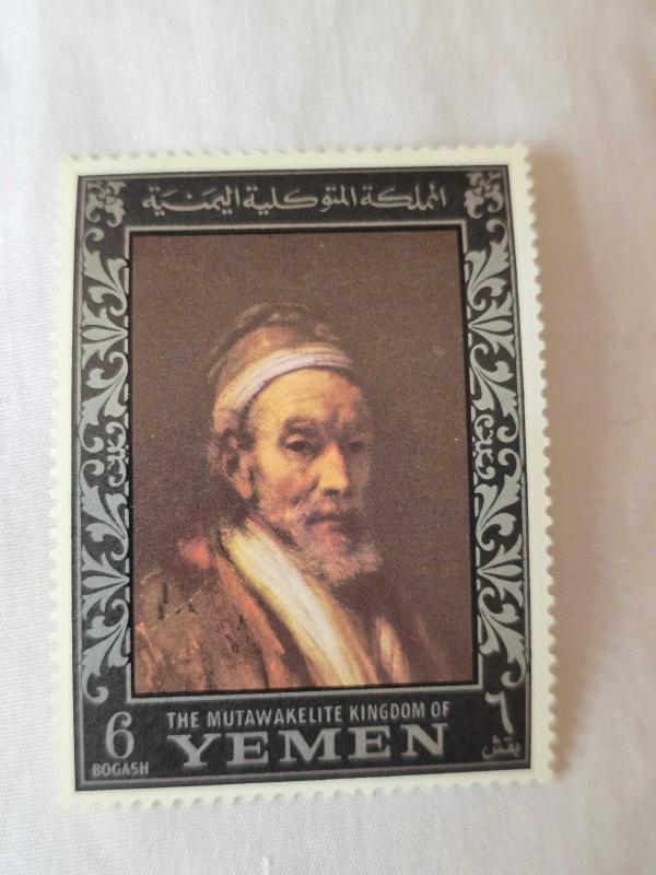 Pulda, Hollandalı ressam Rembrandt van Rijn'in genellikle "Head of an Old Man" (Yaşlı Bir Adamın Başı) veya benzer bir karaktere odaklanan bir tronie (karakter çalışması) resmi yer almaktadır. Bu tür çalışmalar, Rembrandt'ın ışık-gölge (chiaroscuro) ustalığını ve yaşlı insan figürlerine olan ilgisini gösterir. İhraç Eden Ülke: Önceki pullarınız gibi bu da Yemen Mütevekkilî Krallığı (The Mutawakelite Kingdom of Yemen) tarafından basılmıştır. Pulun nominal değeri 6 Bogash'tır. Emisyon Yılı: Bu pul, büyük olasılıkla bir önceki pullarla aynı sanatsal seri içinde yer almaktadır. Bu pulların çoğu 1960'lı yılların sonlarında (özellikle 1967 veya 1969 civarında) yayımlanmıştır. Arama sonuçlarında, 1968 tarihli benzer Rembrandt pullarından bahsedilmektedir, bu da genel aralığı doğrular.