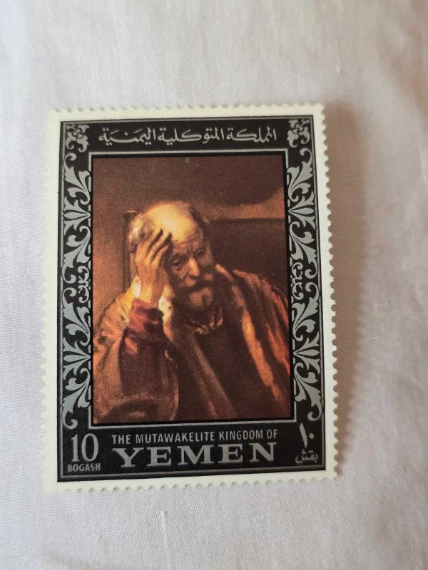 Pulda, Hollandalı usta ressam Rembrandt van Rijn'in ünlü tablosu "Philosopher in Meditation" (Düşünen Filozof) yer almaktadır. Eserin orijinali 1632 tarihlidir ve günümüzde Paris'teki Louvre Müzesi'nde sergilenmektedir. Tabloda yaşlı bir adamın, bir türbin veya spiral merdivenin bulunduğu loş bir odada düşünceli bir şekilde, elini başına dayayarak oturuşu resmedilmiştir. İhraç Eden Ülke: Pul, diğerleri gibi Yemen Mütevekkilî Krallığı (The Mutawakelite Kingdom of Yemen) tarafından basılmıştır. Pulun nominal değeri 10 Bogash'tır. Emisyon Yılı: Bu pul da, diğer Rembrandt temalı pullar gibi, büyük ihtimalle 1960'ların sonlarında (özellikle 1967 veya 1969 civarında) yayımlanan sanat serisinin bir parçasıdır.