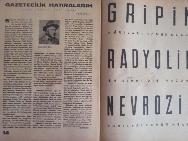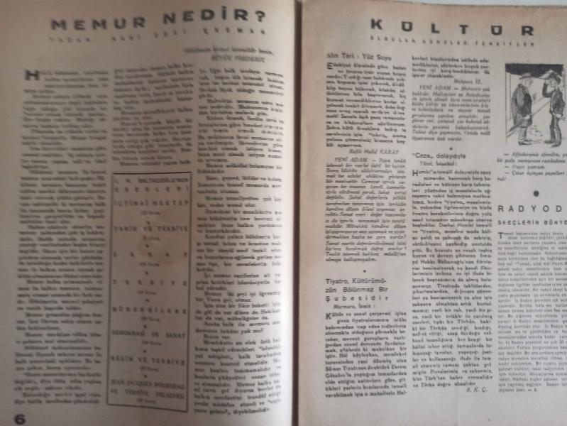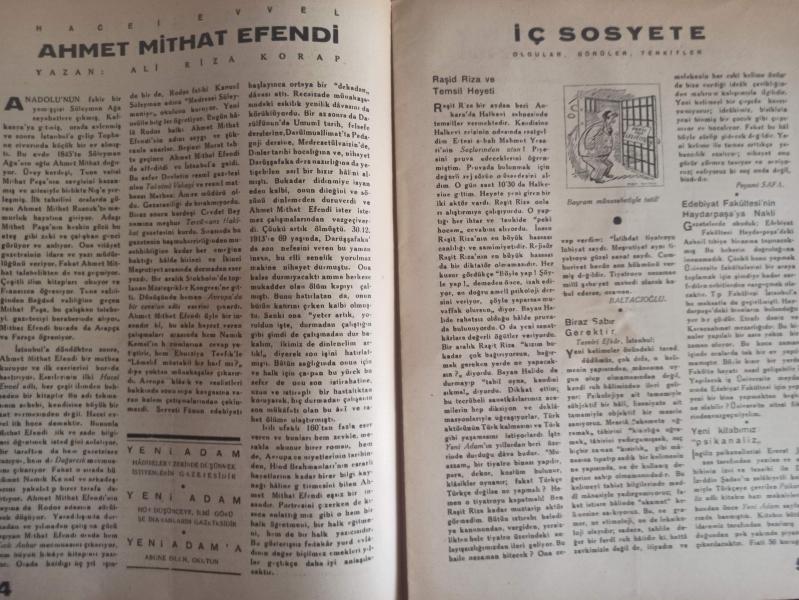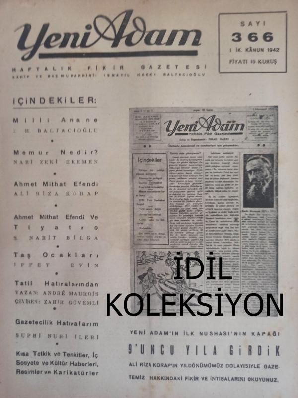 Yeni Adam Siyasi, Edebi ve Tarih Dergisi - 1 Ocak 1942 - Sayı:366 - 9. Yılımıza Girdik - Ali Rıza Kopan'ın Yıldönümümüz Dolayısıyla Yazdığı Yazı - Milli Anane - Bir Devlet Kurmak Kolay, Bir Millet Yapmak Pek Güç, Fakat Bir Anane Yaratmak Muhaldir - Kısa Tetkik ve Tenkitler - Ahmet Mithat - Tiyatro Edebiyat Mıdır? - Hacei Evvel Ahmet Mithat Efendi - Ali Rıza Korap - İç Sosyete - Olgular, Görüler, Tenkitler - Biraz Sabır Gerektir - Memur Nedir? - Nabi Zeki Ekeman - Radyoda Skeçlerin Bünyesi - Türk Çocuğu - Ahmet Mithat ve Tiyatro - Nahit Bilga - Tatil Hatıralarından - Andre Maurois - Taş Ocakları - İffet Evin - Gazetecilik Hatıralarım - Suphi Nuri İleri - Gripin, Radyolin, Nevrozin İlaç Reklamı - Şarap Reklamı fotoğraf ve haberi - Tam Takım Dergi Yıpranma, sararmalar, kupon kesiği ve yırtılmalar zamana bağlı olarak görülebilir