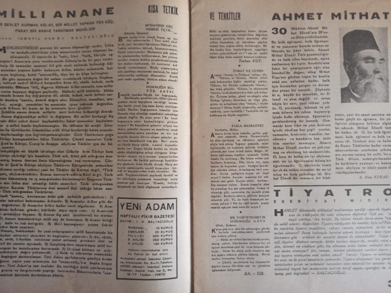 Yeni Adam Siyasi, Edebi ve Tarih Dergisi - 1 Ocak 1942 - Sayı:366 - 9. Yılımıza Girdik - Ali Rıza Kopan'ın Yıldönümümüz Dolayısıyla Yazdığı Yazı - Milli Anane - Bir Devlet Kurmak Kolay, Bir Millet Yapmak Pek Güç, Fakat Bir Anane Yaratmak Muhaldir - Kısa Tetkik ve Tenkitler - Ahmet Mithat - Tiyatro Edebiyat Mıdır? - Hacei Evvel Ahmet Mithat Efendi - Ali Rıza Korap - İç Sosyete - Olgular, Görüler, Tenkitler - Biraz Sabır Gerektir - Memur Nedir? - Nabi Zeki Ekeman - Radyoda Skeçlerin Bünyesi - Türk Çocuğu - Ahmet Mithat ve Tiyatro - Nahit Bilga - Tatil Hatıralarından - Andre Maurois - Taş Ocakları - İffet Evin - Gazetecilik Hatıralarım - Suphi Nuri İleri - Gripin, Radyolin, Nevrozin İlaç Reklamı - Şarap Reklamı fotoğraf ve haberi - Tam Takım Dergi, İsmail Hakkı Baltacıoğlu tarafından kaleme alınmıştır. Kitap 1942 yılında Selamet Matbaası tarafından [İstanbul] yayınlanmıştır. 16 sayfadır. Yeni Adam Siyasi, Edebi ve Tarih Dergisi - 1 Ocak 1942 - Sayı:366 - 9. Yılımıza Girdik - Ali Rıza Kopan'ın Yıldönümümüz Dolayısıyla Yazdığı Yazı - Milli Anane - Bir Devlet Kurmak Kolay, Bir Millet Yapmak Pek Güç, Fakat Bir Anane Yaratmak Muhaldir - Kısa Tetkik ve Tenkitler - Ahmet Mithat - Tiyatro Edebiyat Mıdır? - Hacei Evvel Ahmet Mithat Efendi - Ali Rıza Korap - İç Sosyete - Olgular, Görüler, Tenkitler - Biraz Sabır Gerektir - Memur Nedir? - Nabi Zeki Ekeman - Radyoda Skeçlerin Bünyesi - Türk Çocuğu - Ahmet Mithat ve Tiyatro - Nahit Bilga - Tatil Hatıralarından - Andre Maurois - Taş Ocakları - İffet Evin - Gazetecilik Hatıralarım - Suphi Nuri İleri - Gripin, Radyolin, Nevrozin İlaç Reklamı - Şarap Reklamı fotoğraf ve haberi - Tam Takım Dergi adlı eser Türkçe dilindedir.