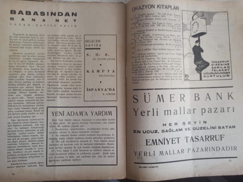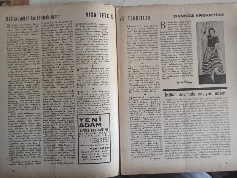 Yeni Adam Siyasi, Edebi ve Tarih Dergisi - 13 Ağustos 1936 - Sayı:137 - Kültürümüzü Kurtarmak Lazım - Kısa Tetkik ve Tenkitler - Dansöz Argantina - İntikal Devrinde Yaşayan Adam - Gençler İçin En Büyük Tehlikeler Kadını Saymamak Alçaklıktır - Memleket Haberleri - İki Türlü Alaka - Türkiye'de Kaç Öğretmen Var? - Trenlerde Mektup ve Telgraf Alınacak - Şark'a Seyahat - Rus Temel Yasası - İspanyol Trajedisi - Dış Sosyete Haberleri - Türkmenistan Dil Kurultayı - Rus Yüksek Mekteplerinde - Avrupa'da Kaç Sinema Var? - Thomas Edison Hayatı ve Eserleri - Yeni Elektrik sistemi - Çalışma Tarzı ve Dehasının Karakteri - Sigmund Freud - Stefan Zweig - İlim ve Teknik Haberleri - Dünya Şimalden Cenuba Döner? - Hayvanlarda Zaman Ölçüsü - Dünyanın En Büyük Patlaması - Yeni Nesillerin Vaktinden Önce Yetişmesi - Manifest Tercümeleri - Kerim Sadi - Gripin İlaç Reklamı - Sanat Haberleri - Milli Musiki - Sanat ve İdeoloji - Balkanlıların Festivali - Babasından Bana Ne? - Hatice Halim - Okazyon Kitaplar - Sümerbank Reklamı - İsmail Hakkı Baltacıoğlu fotoğraf ve haberi - Tam Takım Dergi Yıpranma, sararmalar, kupon kesiği ve yırtılmalar zamana bağlı olarak görülebilir
