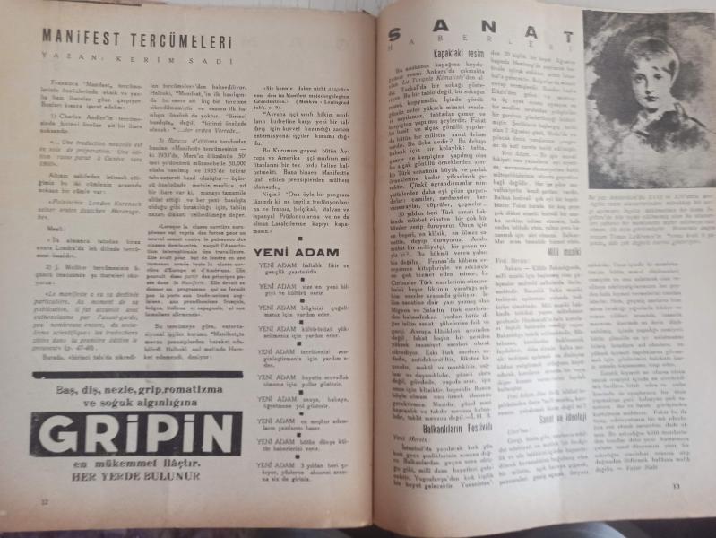 Yeni Adam Siyasi, Edebi ve Tarih Dergisi - 13 Ağustos 1936 - Sayı:137 - Kültürümüzü Kurtarmak Lazım - Kısa Tetkik ve Tenkitler - Dansöz Argantina - İntikal Devrinde Yaşayan Adam - Gençler İçin En Büyük Tehlikeler Kadını Saymamak Alçaklıktır - Memleket Haberleri - İki Türlü Alaka - Türkiye'de Kaç Öğretmen Var? - Trenlerde Mektup ve Telgraf Alınacak - Şark'a Seyahat - Rus Temel Yasası - İspanyol Trajedisi - Dış Sosyete Haberleri - Türkmenistan Dil Kurultayı - Rus Yüksek Mekteplerinde - Avrupa'da Kaç Sinema Var? - Thomas Edison Hayatı ve Eserleri - Yeni Elektrik sistemi - Çalışma Tarzı ve Dehasının Karakteri - Sigmund Freud - Stefan Zweig - İlim ve Teknik Haberleri - Dünya Şimalden Cenuba Döner? - Hayvanlarda Zaman Ölçüsü - Dünyanın En Büyük Patlaması - Yeni Nesillerin Vaktinden Önce Yetişmesi - Manifest Tercümeleri - Kerim Sadi - Gripin İlaç Reklamı - Sanat Haberleri - Milli Musiki - Sanat ve İdeoloji - Balkanlıların Festivali fotoğraf ve haberi - Tam Takım Dergi adlı eser, Kitap > Süreli Yayınlar > Dergiler > Edebiyat kategorisinde İkinci El olarak satıştadır.