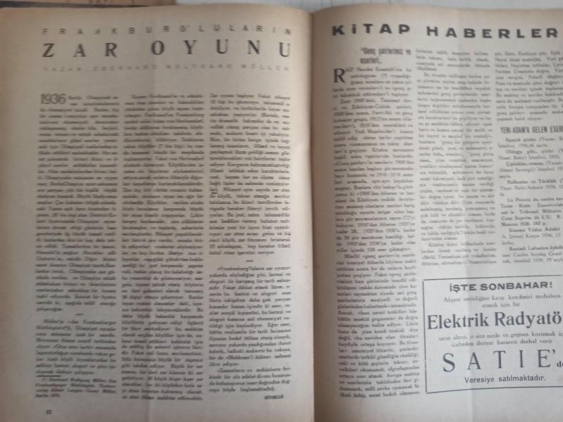 Yeni Adam Siyasi, Edebi ve Tarih Dergisi - 22 Eylül 1936 - Sayı:147 - Öğretmeni Koru - İsmail Hakkı Baltacıoğlu - Kısa Tetkik ve Tenkitler - Dr. Hulusi Fırat - Kadın Asker Olur mu? - Fonksiyonel Terbiye - Dr. Clap Parede - İç Sosyete Haberleri - Türk Sporunun Tarihi - Niğde ve Diyarbakır'da - Gaziantep Halkevi - Balkan Hekimler Birliği - Politika Aleminde Olanlar - Dış Sosyete Haberleri - Almanya'da Din Gerginliği Kalmadı - Alman Masonları İçin - İlk Negro Hakim - Yeni Moskova Stadı - Malta'nın Yeni Anayasası - Uyku Nedir? - Niçin Uyuruz? - Emile Malespine - Kültür Haberleri - Bir Delikanlıya Açık Mektup - Arnavutluk - Frankburgluların Zar Oyunu - Kitap Haberleri - Eberhard Wolfgang Möller - Hayatım - İsmail Hakki Baltacıoğlu - İlim ve Teknik Haberleri - Antoine Meillet'in Ölümü - Ray ve Yol - Ekonomi Haberleri - Kayseri Fabrikası - İstanbul'un Giret ve Çıkalı - Marx'ın Mektuplarından - Kerim Sadi - Sümerbank Reklamı - Siz Tatlı Misket Şarabını Almakta Tereddüt Etmeyiniz! fotoğraf ve haberi - Tam Takım Dergi Yıpranma, sararmalar, kupon kesiği ve yırtılmalar zamana bağlı olarak görülebilir