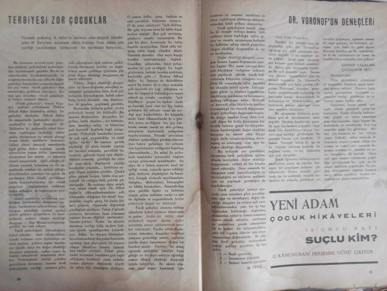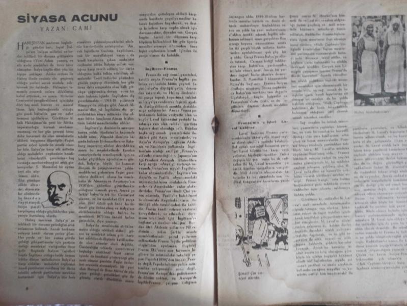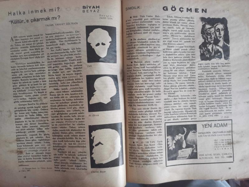 Yeni Adam Siyasi, Edebi ve Tarih Dergisi - 5 Aralık 1935 - Sayı:101 - Terbiyesi Zor Çocuklar - Tarihi Nasıl İzah Ettim - Kısa Tetkik ve Tenkitler - Çeteci Kadın - Moda mı? - Zekeriya Sofrası - Eksibe mi? - Değer Bolluğu - II'nci Yorgi - Yeni Adam, Her Şeyden Önce Otlakçı Olayandır - İsmail Hakkı Baltacı - Engels'in Bir Haşiyesine Dair - Kerim Sadi - Gripin İlaç Reklamı - Siyasa Acunu - Cami - Fransa'nın İç İşleri Laval Kabinesi - Kültür Tetkikleri - Soy Adlarına Göre - Zahir Sıtkı Güvem - Dr. Voronof'un Deneçleri - Halka İnmek mi? - Kültür'e Çıkarmak mı? - Siyah Beyaz - Göçmen - Ölüler - İkinci Perde - Türk Antrasitidir fotoğraf ve haberi - Tam Takım Gazete Yıpranma, sararmalar, kupon kesiği ve yırtılmalar zamana bağlı olarak görülebilir