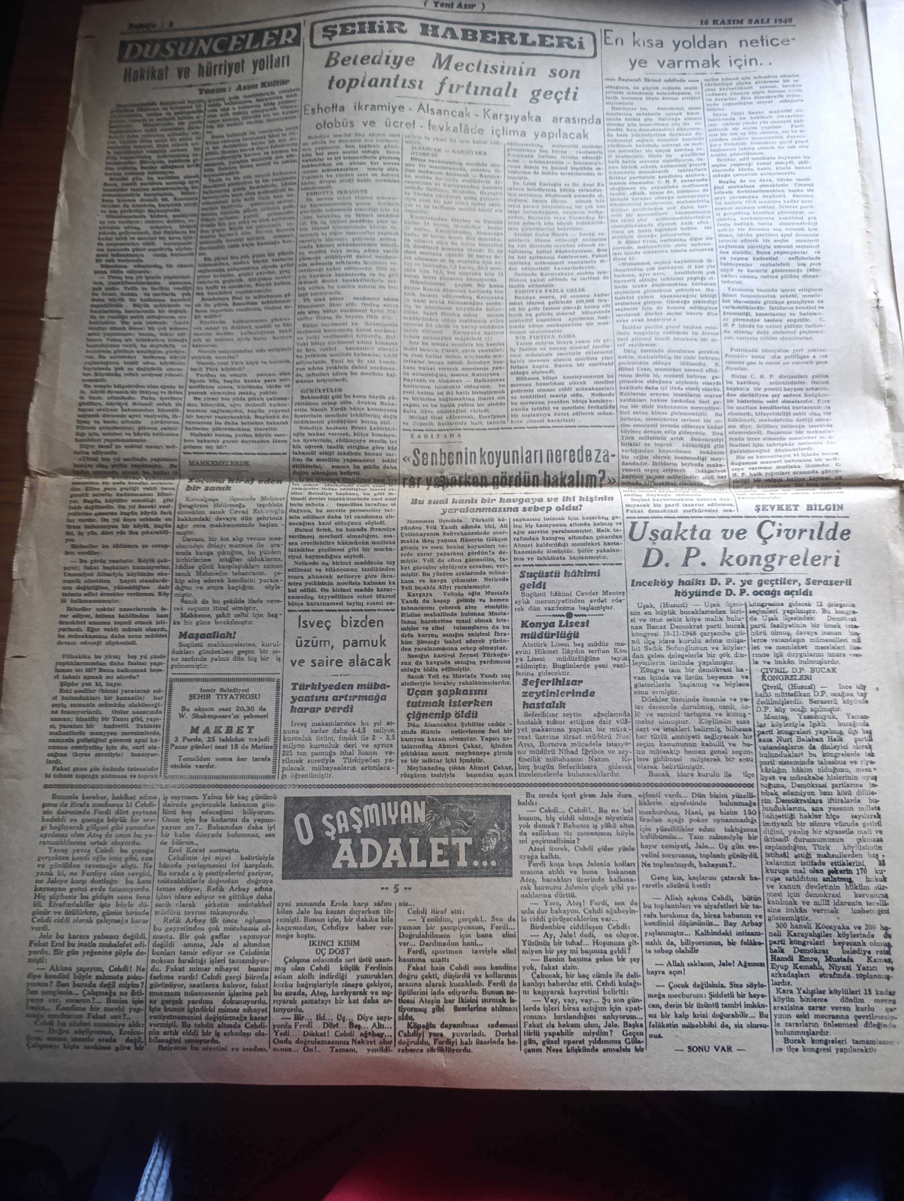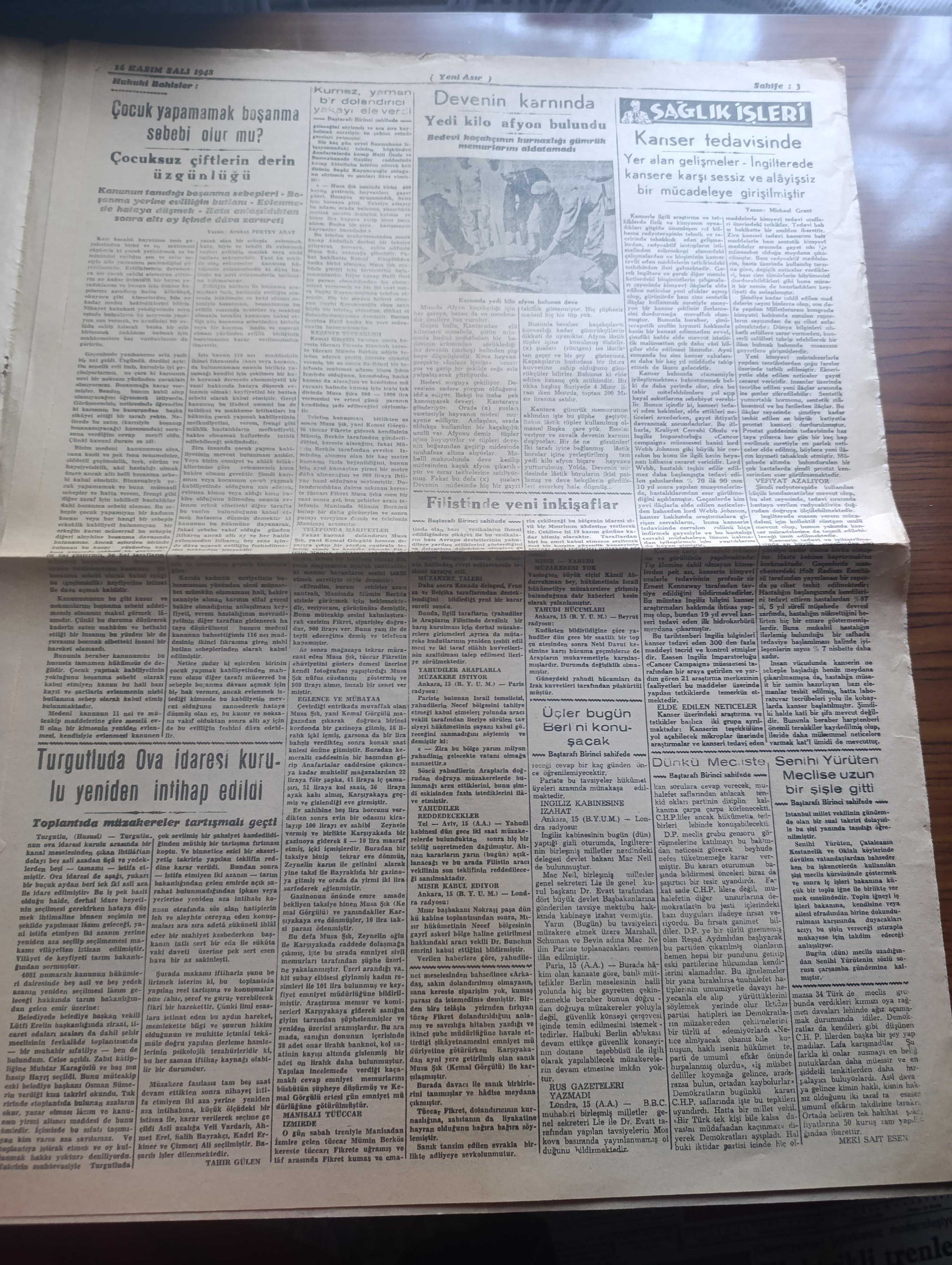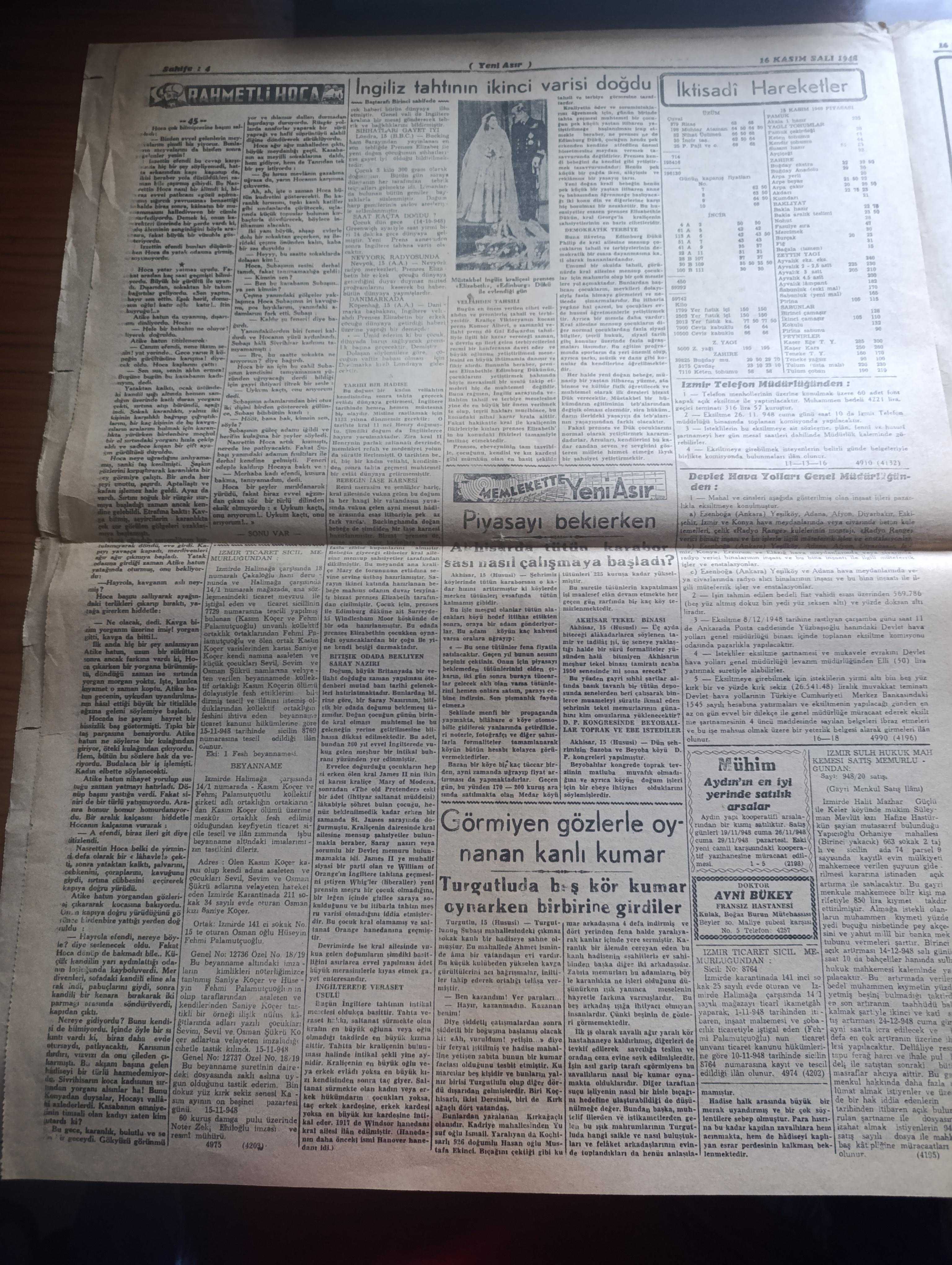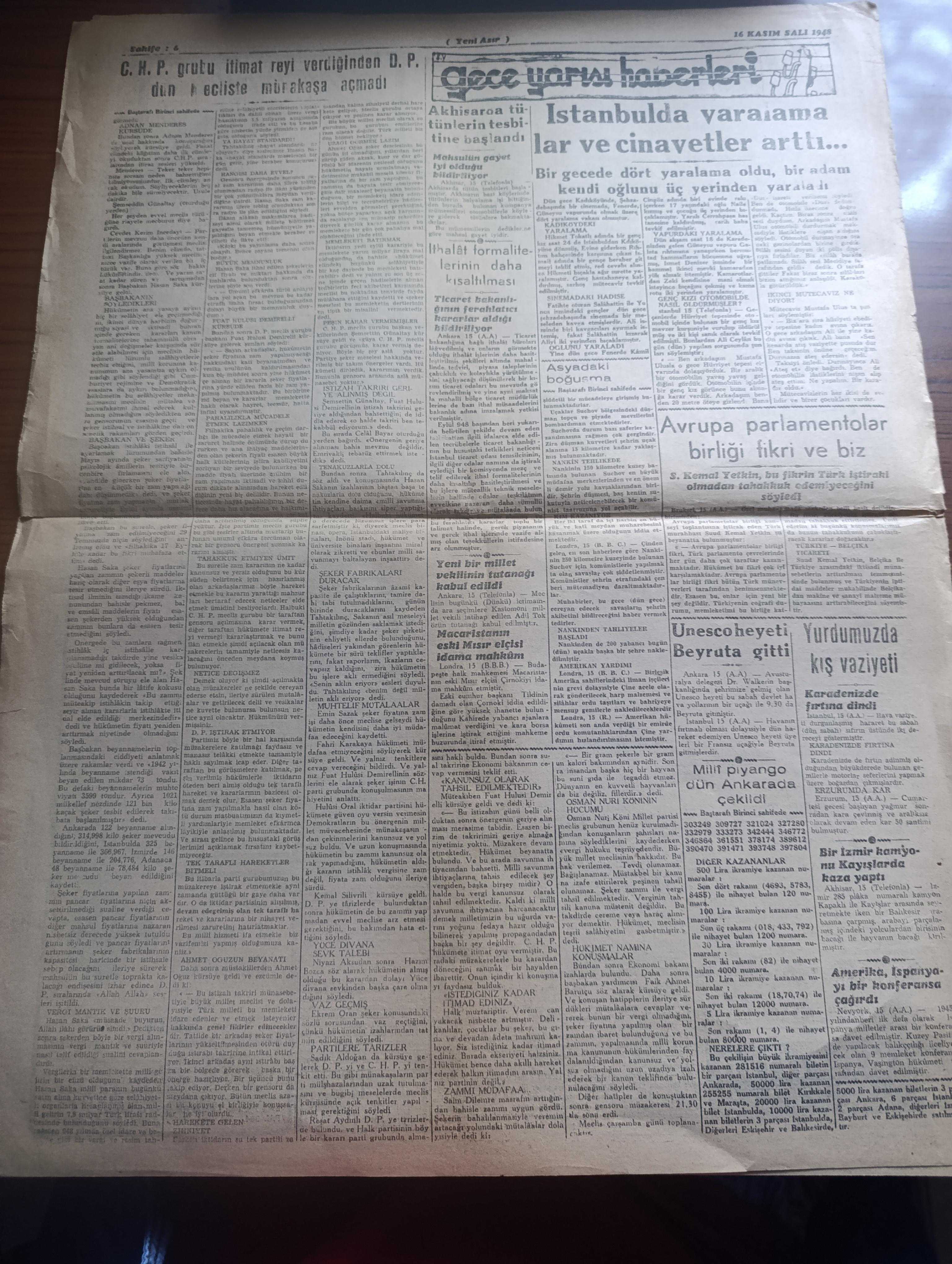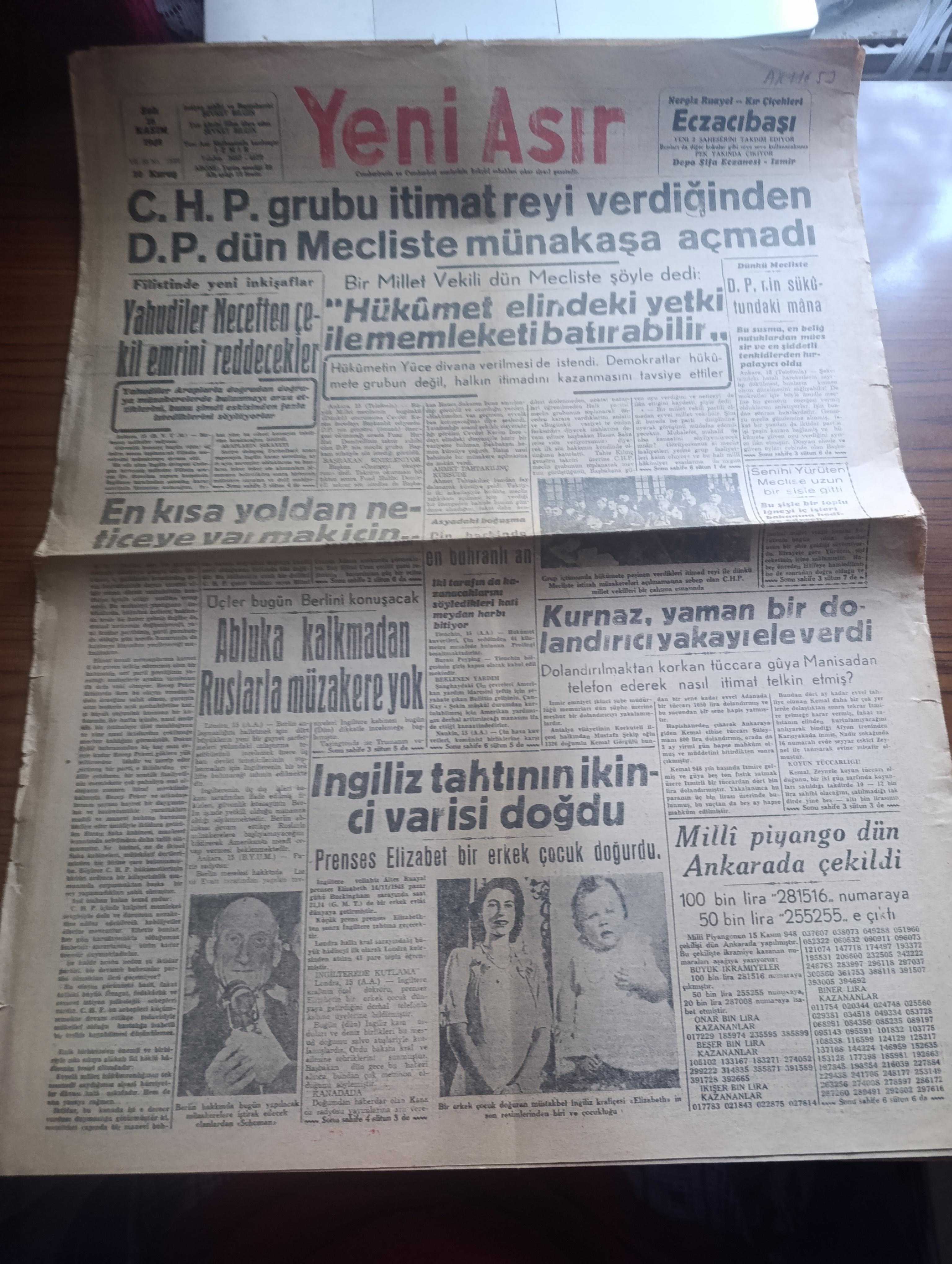 Yeni Asır Gazetesi - 16 Kasım 1948 - CHP grubu itimatrayı verdiğinden Demokrat Parti mecliste münakaşa açmadı - Filistin'de yeni inkişaflar Yahudiler Necef'ten çekil emrini reddedecekler - bir milletvekili dün mecliste şöyle dedi hükümet elindeki yetki ile memleketi batırabilir - dünkü mecliste Demokrat Parti'nin sükutundaki mana - İstanbul milletvekili Senihi Yürüten meclise uzun bir şişle gitti - Üçler bugün berlin'i konuşacak albuka kalkmadan Ruslarla müzakere yok - İngiliz tahtının ikinci varisi doğdu - prenses Elizabeth bir erkek çocuk doğurdu fotoğraf - Milli Piyango Dün Ankara'da çekildi 100 bin lira 281516 numaraya çıktı -Eczacıbaşı - devenin karnında yedi kilo Afyon bulundu - rahmetli Hoca yazı dizisi - iktisadi hareketler - Durmuş Yaşar boya inşaat malzemesi - Bayer - göz hastalıkları mütehassısı Doktor Şehime Gökbaş - Avrupa parlamentolar Birliği fikri ve biz - UNESCO heyeti beyrut'a gitti - yeni bir milletvekili Adil Tok'un tutanağı kabul edildi - Emin Sazak, Şevket Bilgin tarafından kaleme alınmıştır. Yeni Asır Gazetesi - 16 Kasım 1948 - CHP grubu itimatrayı verdiğinden Demokrat Parti mecliste münakaşa açmadı - Filistin'de yeni inkişaflar Yahudiler Necef'ten çekil emrini reddedecekler - bir milletvekili dün mecliste şöyle dedi hükümet elindeki yetki ile memleketi batırabilir - dünkü mecliste Demokrat Parti'nin sükutundaki mana - İstanbul milletvekili Senihi Yürüten meclise uzun bir şişle gitti - Üçler bugün berlin'i konuşacak albuka kalkmadan Ruslarla müzakere yok - İngiliz tahtının ikinci varisi doğdu - prenses Elizabeth bir erkek çocuk doğurdu fotoğraf - Milli Piyango Dün Ankara'da çekildi 100 bin lira 281516 numaraya çıktı -Eczacıbaşı - devenin karnında yedi kilo Afyon bulundu - rahmetli Hoca yazı dizisi - iktisadi hareketler - Durmuş Yaşar boya inşaat malzemesi - Bayer - göz hastalıkları mütehassısı Doktor Şehime Gökbaş - Avrupa parlamentolar Birliği fikri ve biz - UNESCO heyeti beyrut'a gitti - yeni bir milletvekili Adil Tok'un tutanağı kabul edildi - Emin Sazak adlı eser Türkçe dilindedir.