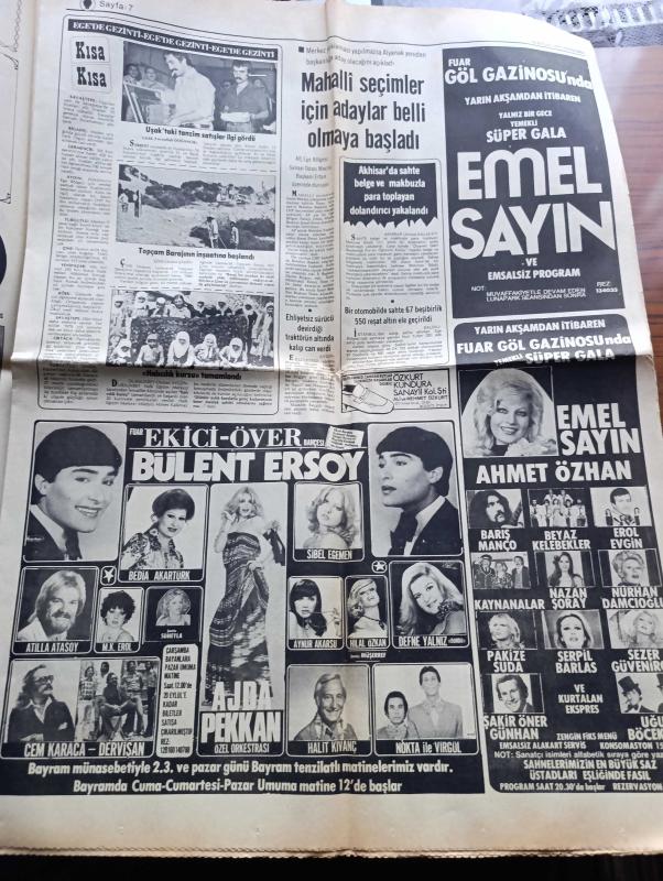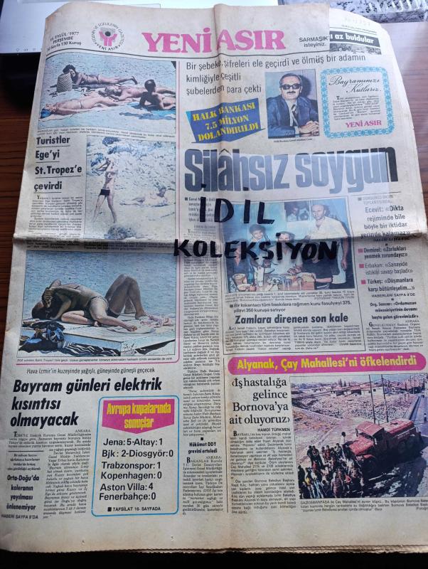 Yeni Asır Gazetesi - Turkish Newspaper - 15 Eylül 1977 - turistler Ege'yi St.Tropez'e çevirdi üstsüz güneşlenenler ortalıkta sevişenler fotoğraf - Halk Bankası 7.5 milyon dolandırıldı - bir şebeke şifreleri ele geçirdi ve ölmüş bir adamın kimliği ile çeşitli şubelerden para çekti - Bülent Ecevit dik dar eşiminde bile böyle bir iktidar yerinde kalamaz dedi - Necmettin Erbakan sanayide İstiklal savaşı başladı - Alparslan Türkeş düşmanlara karşı bütünleşelim - Süleyman Demirel zorlukları yenmek zorundayız - bayram günleri elektrik kısıntısı olmayacak - Avrupa kupası'nda sonuçlar - Aston Villa 4 Fenerbahçe 0 - Trabzonspor 1 Kopenhagen 0 - Belediye Başkanı İhsan Alyanak çay mahallesi'ni öfkelendirdi - Fatma Girik'e SSCB pavyonunda hediye yağdı - Bayram tebrik mesajları - Emel Sayın tam sayfa fotoğraf fuar lunapark gazinosunda - Emel Sayın Barış Manço Erol Evgin Nazan Şoray Nurhan Damcıoğlu Beyaz Kelebekler Fuar göl gazinosunda - Müzeyyen Senar Huysuz Virjin - Sezen Aksu - Gönül Yazar, Dinç Bilgin tarafından kaleme alınmıştır. Yeni Asır Gazetesi - Turkish Newspaper - 15 Eylül 1977 - turistler Ege'yi St.Tropez'e çevirdi üstsüz güneşlenenler ortalıkta sevişenler fotoğraf - Halk Bankası 7.5 milyon dolandırıldı - bir şebeke şifreleri ele geçirdi ve ölmüş bir adamın kimliği ile çeşitli şubelerden para çekti - Bülent Ecevit dik dar eşiminde bile böyle bir iktidar yerinde kalamaz dedi - Necmettin Erbakan sanayide İstiklal savaşı başladı - Alparslan Türkeş düşmanlara karşı bütünleşelim - Süleyman Demirel zorlukları yenmek zorundayız - bayram günleri elektrik kısıntısı olmayacak - Avrupa kupası'nda sonuçlar - Aston Villa 4 Fenerbahçe 0 - Trabzonspor 1 Kopenhagen 0 - Belediye Başkanı İhsan Alyanak çay mahallesi'ni öfkelendirdi - Fatma Girik'e SSCB pavyonunda hediye yağdı - Bayram tebrik mesajları - Emel Sayın tam sayfa fotoğraf fuar lunapark gazinosunda - Emel Sayın Barış Manço Erol Evgin Nazan Şoray Nurhan Damcıoğlu Beyaz Kelebekler Fuar göl gazinosunda - Müzeyyen Senar Huysuz Virjin - Sezen Aksu - Gönül Yazar adlı eser Türkçe dilindedir.