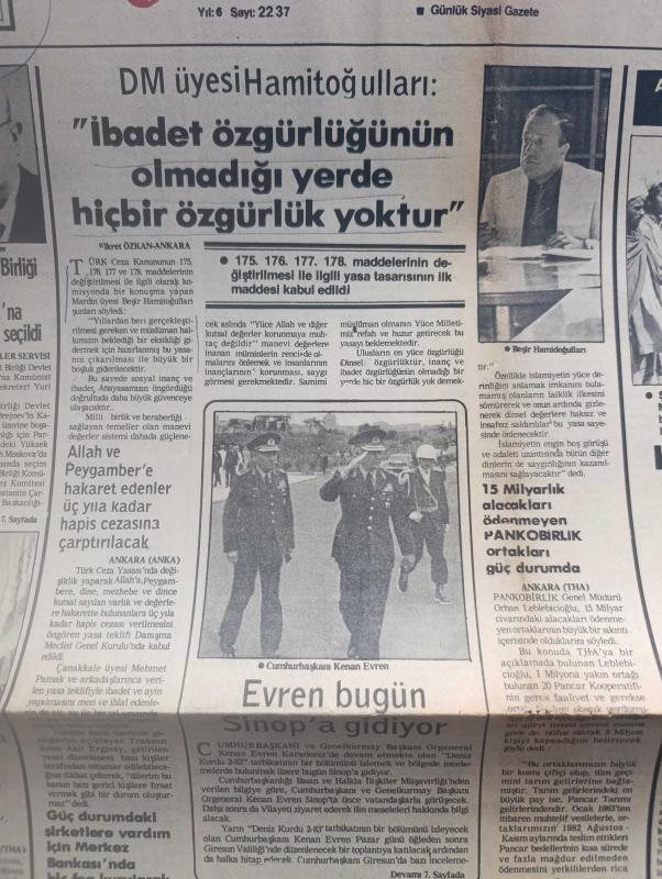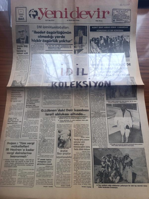 Yeni Devir Gazetesi - Turkish Newspaper - 17 Haziran 1983 - DM üyesi Beşir Hamitoğulları ibadet özgürlüğünün olmadığı yerde hiçbir özgürlük yoktur dedi - Sovyetler Birliği devlet başkanlığına Andropov seçildi - 15 milyarlık alacakları ödenmeyen PANKOBİRLİK ortakları güç durumda - Kenan Evren bugün sinop'a gidiyor - Allah ve peygambere hakaret edenler 3 yıla kadar hapis cezasına çarptırılacak - Başbakan Bülent Ulusu İzmir entegre et ve yem tesislerinin temelini attı - FKÖ Lideri Yaser Arafat bazı gruplar soyutlanabilir dedi - Güney Lübnan'daki Deir kasabası İsrail ablukası altında - Albay Şehit Abbas Kerim Karargah komutanı ile bir konuşma Fotoğrafı - Her İki süper güç de Müslümanlara karşı imha planı hazırlıyor - İstanbul cami ve külliyeleri yazan Mine Alpay - İslam dinamizmine doğru denemeler yazan Kasım Ahmed - ibret alınacak fıkra ve hikayeler yazan Ali Osman Yüksel - oruç ve faziletleri yazan Ahmet Ürkmezoğlu - beyaz insanın hakimiyet devri bitti yazan profesör Seyyid Kutup, Gürgen Mazhar Bayatlı tarafından kaleme alınmıştır. Yeni Devir Gazetesi - Turkish Newspaper - 17 Haziran 1983 - DM üyesi Beşir Hamitoğulları ibadet özgürlüğünün olmadığı yerde hiçbir özgürlük yoktur dedi - Sovyetler Birliği devlet başkanlığına Andropov seçildi - 15 milyarlık alacakları ödenmeyen PANKOBİRLİK ortakları güç durumda - Kenan Evren bugün sinop'a gidiyor - Allah ve peygambere hakaret edenler 3 yıla kadar hapis cezasına çarptırılacak - Başbakan Bülent Ulusu İzmir entegre et ve yem tesislerinin temelini attı - FKÖ Lideri Yaser Arafat bazı gruplar soyutlanabilir dedi - Güney Lübnan'daki Deir kasabası İsrail ablukası altında - Albay Şehit Abbas Kerim Karargah komutanı ile bir konuşma Fotoğrafı - Her İki süper güç de Müslümanlara karşı imha planı hazırlıyor - İstanbul cami ve külliyeleri yazan Mine Alpay - İslam dinamizmine doğru denemeler yazan Kasım Ahmed - ibret alınacak fıkra ve hikayeler yazan Ali Osman Yüksel - oruç ve faziletleri yazan Ahmet Ürkmezoğlu - beyaz insanın hakimiyet devri bitti yazan profesör Seyyid Kutup adlı eser Türkçe dilindedir.