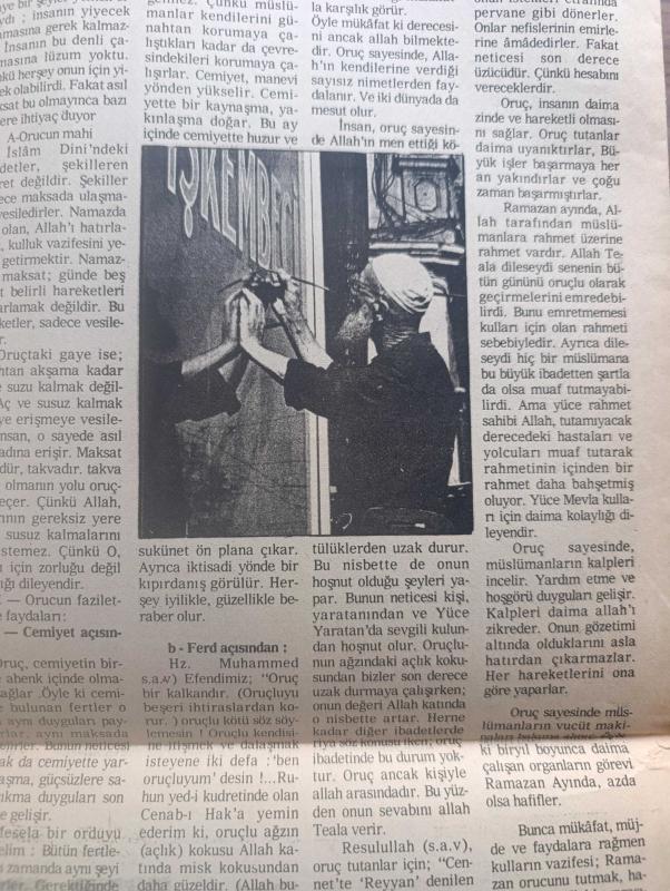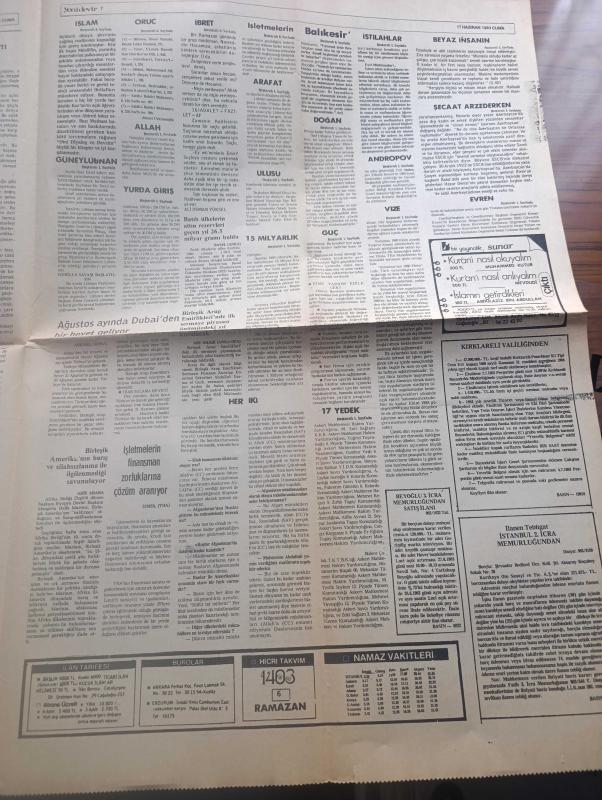 Yeni Devir Gazetesi - Turkish Newspaper - 17 Haziran 1983 - DM üyesi Beşir Hamitoğulları ibadet özgürlüğünün olmadığı yerde hiçbir özgürlük yoktur dedi - Sovyetler Birliği devlet başkanlığına Andropov seçildi - 15 milyarlık alacakları ödenmeyen PANKOBİRLİK ortakları güç durumda - Kenan Evren bugün sinop'a gidiyor - Allah ve peygambere hakaret edenler 3 yıla kadar hapis cezasına çarptırılacak - Başbakan Bülent Ulusu İzmir entegre et ve yem tesislerinin temelini attı - FKÖ Lideri Yaser Arafat bazı gruplar soyutlanabilir dedi - Güney Lübnan'daki Deir kasabası İsrail ablukası altında - Albay Şehit Abbas Kerim Karargah komutanı ile bir konuşma Fotoğrafı - Her İki süper güç de Müslümanlara karşı imha planı hazırlıyor - İstanbul cami ve külliyeleri yazan Mine Alpay - İslam dinamizmine doğru denemeler yazan Kasım Ahmed - ibret alınacak fıkra ve hikayeler yazan Ali Osman Yüksel - oruç ve faziletleri yazan Ahmet Ürkmezoğlu - beyaz insanın hakimiyet devri bitti yazan profesör Seyyid Kutup adlı eser, Kitap > Süreli Yayınlar > Gazeteler > Türkiye > Genel > Günlük kategorisinde İkinci El olarak satıştadır.