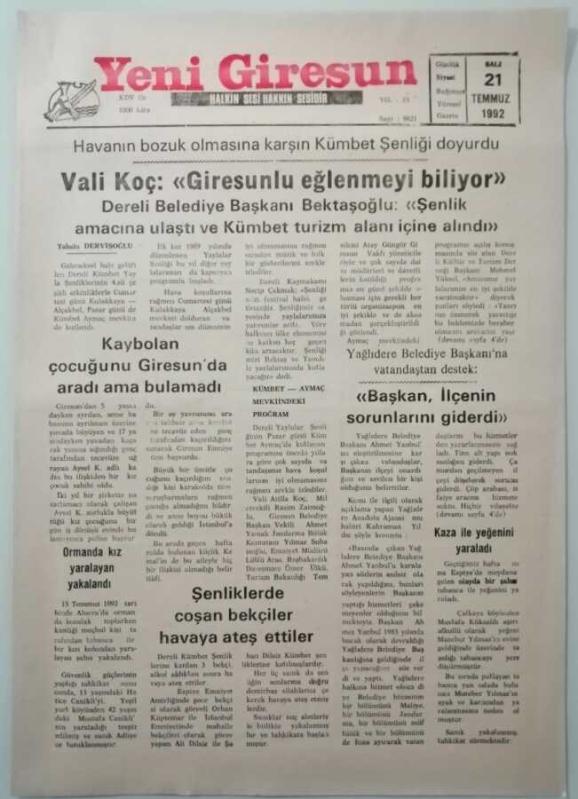 Yeni Giresun Gazetesi 21 Temmuz 1992 Havanın Bozuk Olmasına Karşın Kümbet Şenliği Doyurdu -GZ37445, en son 19 gün önce güncellenmiştir.