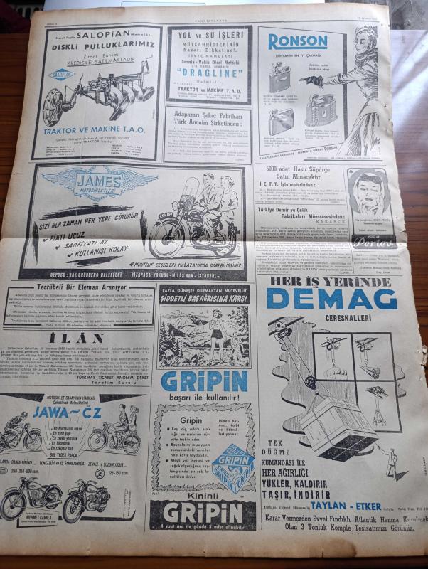 Yeni İstanbul Gazetesi - 12 Ağustos 1952 - Mustafa Nermi - İran Başbakanı Musaddık'a Fevkalade Salahiyetler Tanındı - Ürdün Kralı Tallal Tahtından İndirildi - Arjantin Cumhurbaşkanı'nın Eşi Eva Peron'un Cenaze Töreni - İngiltere Dışişleri Bakanı Eden Churchill'in Yegeniyle Evleniyor - Çanakkale Şehitleri Dün Anıldı - Etibank Garp Linyitleri Soma İşletmesi Dün Açıldı - Esir Şehrin İnsanları Yazan Nureddin Demir (Kemal Tahir) Yazı Dizisi - Hakimler Kanunu Tasarısı Hakkında Yeni Fikirler - Bergama Etnografya Müzesi Dün Açıldı - Birleşik Amerika İsrail'e Silah Satacak - İsraile Satılan Kepekler Gemiye Yükleniyor - Dünya Ticaret Rekoru 1951'de Yeni Bir Rekor Kırdı - Geiger Sayıcısı İle Bir Katil Nasıl Bulundu - Penny Ridgway Paris'in En Şık Kadını Olmaya Namzet - İngiltere'nin En Meşhur Karikatüristi Giles - Kral Faruk Tahttan Nasıl Düştü - Ronson Dünyanın En İyi Çakmağı - James Motosikletleri - Jawa Motosikletleri - Gripin adlı eser, Kitap > Süreli Yayınlar > Gazeteler > Türkiye > Genel > Günlük kategorisinde İkinci El olarak satıştadır.
