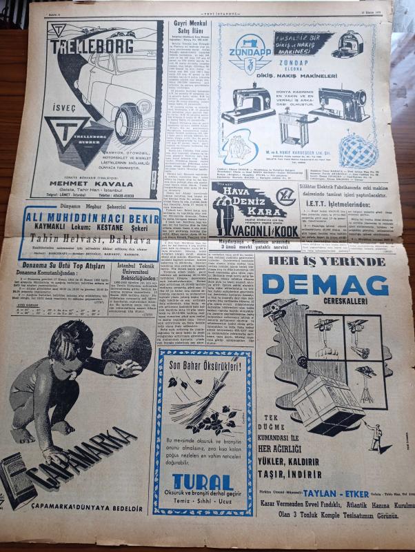 Yeni İstanbul Gazetesi - 13 Kasım 1952 - Seferihisar Çıkarmasında Başarı Elde Edildi - Eisenhower Truman Mülakatı 18 Kasım'da - Tanrı Uludur - Birleşmiş Milletler'e Genel Sekreter Aranıyor - Adana Erkek Lisesi Edebiyat Öğretmeni Şevket Kutkan'ın Atatürk'e Şiiri - Hüseyin Rahmi Gürpınar Ve Romanları - Kore'de Kanlı Çarpışmalar - Avrupa Ödeme Birliğinden Türkiye'ye 20 Milyon Dolarlık Kredi - Büyük Kardeşim Atatürk Anlatan Makbule Atadan Yazı Dizisi - Denizlerin Efesi Gazi Umur Paşa Yazan Tevfik İnci Yazı Dizisi - Stalin'in Yerini Kim Alabilir - Rita Hayworth'a Ödenecek Nafaka - İsrail Tazminatına Birleşmiş Milletler'de De İtiraz Ediliyor - Kerim Ömer Çağlar - Dişi Hamlet Elektra - Uçan Daireler Ve Halk Psikolojisi - Demag Cereskalleri - Trelleborg Lastikleri - Zündapp Motosikletleri - Çapamarka adlı eser, Kitap > Süreli Yayınlar > Gazeteler > Türkiye > Genel > Günlük kategorisinde İkinci El olarak satıştadır.