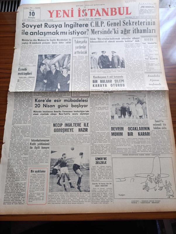 Yeni İstanbul Gazetesi - 13 Nisan 1953 - Sovyet Rusya İngiltere İle Anlaşmak İstiyor - CHP Genel Sekreteri Kasım Gülek'in Mersin'deki Ağır İthamları - Amerika Yakınşarka Yardımlar Arttırılacak - Anadolu Ajansı Taşlandı - Kore'de Esir Mübadelesi 20 Nisan Günü Başlıyor - Ecnebi Mektepleri - İstanbulumuzun Fetih Yıldönümü İle İlgili Kongre - Devrim Ocaklarının Mühim Bir Kararı - Mustafa Nermi - Küçük İnsanlar Yazan Faik Baysal Yazı Dizisi - Fenerbahçe'de Yeni Açılan Kulüplere 104 Tekne Hediye Edildi - Komünistler Ellerindeki Esirlere Daimi Baskı Yapıyor - Dumlupınar Denizaltısı Şehitleri İçin Mevlit - Zenci Kız Kansas Şehri Belediye Başkanlığına Seçildi - Azra Bora - Hüseyin Avni Şanda - Ankara İstanbul Radyosu Programı - Büyük Röportaj Serisi İslam Memleketleri Yazan Fikret Adil Yazı Dizisi - Çanakkale Kupasında Vefa Beşiktaş'ı 3 2 Mağlup Etti - Galatasaray Ankaragücü'nü 3 2 Yendi - Jawa Motosikletleri - Arı Bisküvileri, Habib Edib Törehan tarafından kaleme alınmıştır. Yeni İstanbul Gazetesi - 13 Nisan 1953 - Sovyet Rusya İngiltere İle Anlaşmak İstiyor - CHP Genel Sekreteri Kasım Gülek'in Mersin'deki Ağır İthamları - Amerika Yakınşarka Yardımlar Arttırılacak - Anadolu Ajansı Taşlandı - Kore'de Esir Mübadelesi 20 Nisan Günü Başlıyor - Ecnebi Mektepleri - İstanbulumuzun Fetih Yıldönümü İle İlgili Kongre - Devrim Ocaklarının Mühim Bir Kararı - Mustafa Nermi - Küçük İnsanlar Yazan Faik Baysal Yazı Dizisi - Fenerbahçe'de Yeni Açılan Kulüplere 104 Tekne Hediye Edildi - Komünistler Ellerindeki Esirlere Daimi Baskı Yapıyor - Dumlupınar Denizaltısı Şehitleri İçin Mevlit - Zenci Kız Kansas Şehri Belediye Başkanlığına Seçildi - Azra Bora - Hüseyin Avni Şanda - Ankara İstanbul Radyosu Programı - Büyük Röportaj Serisi İslam Memleketleri Yazan Fikret Adil Yazı Dizisi - Çanakkale Kupasında Vefa Beşiktaş'ı 3 2 Mağlup Etti - Galatasaray Ankaragücü'nü 3 2 Yendi - Jawa Motosikletleri - Arı Bisküvileri adlı eser Türkçe dilindedir.