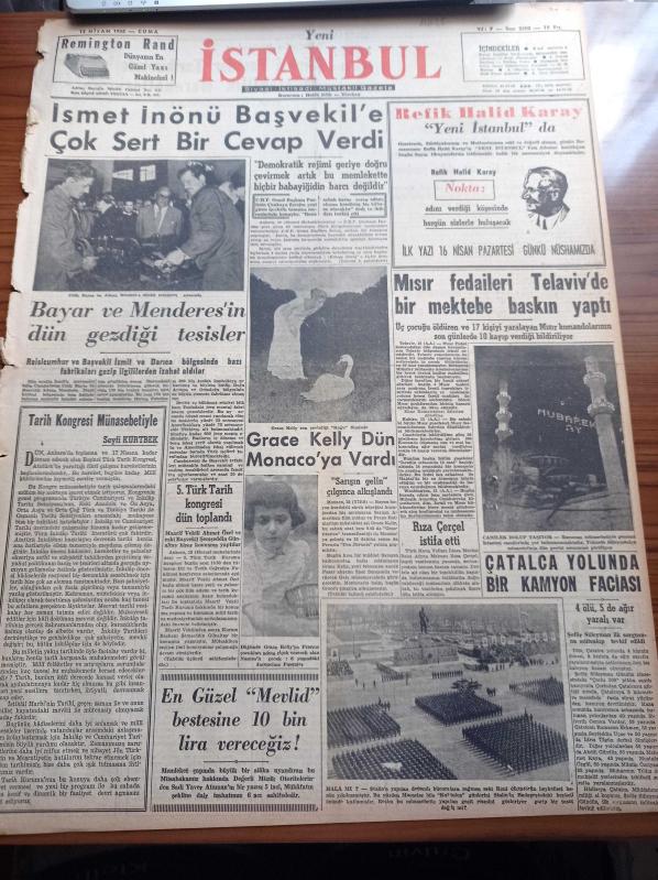 Yeni İstanbul Gazetesi - 13 Nisan 1956 - İsmet İnönü Başvekil Adnan Menderes'e Çok Sert Bir Cevap Verdi - Celal Bayar ve Adnan Menderes'in Dün Gezdiği Tesisler - Refik Halid Karay Yeni İstanbul'da - Mısır Fedaileri Telaviv'de Bir Mektebe Baskın Yaptı - Grace Kelly Dün Monaco'ya Vardı - Türk Hava Yolları İdare Meclisi Reisi Rıza Çerçel İstifa Etti - En Güzel Mevlid Bestesine 10 Bin Lira Vereceğiz - İstanbul Teknik Üniversitesi Sanat Kulübü Sahnesi - Siyasi Partiler Tarihimizde Müstakillik Hareketleri - 5. Türk Tarih Kurumu Çalışmalarına Başladı - Mimar Sinan'ın Heykeli Dün Merasimle Açıldı - Milano Fuarı Dün Resmen Açıldı - Radyo - Macarlarla İlk Güreş Yarın Akşam Yapılıyor - Muhittin Bulgurlu Fenerbahçe'den Çıkarıldı - Vasco Do Gama'nın Ankara Maçları - Brezilya Milli Maçı İçin Yapılan Hazırlıklar - Milli Futbol Takımı Trieste Sahasında İtalyanlarla Birlikte adlı eser Türkçe dilindedir.