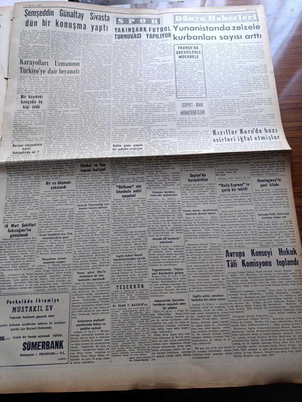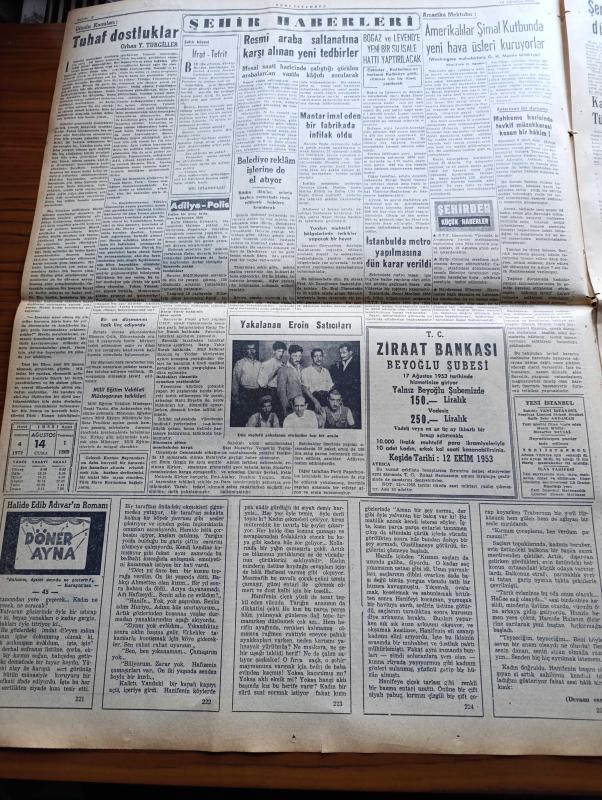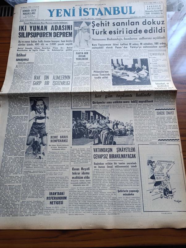 Yeni İstanbul Gazetesi - 14 Ağustos 1953 - İki Yunan Adasını Silip Süpüren Deprem - Şehit Sanılan Dokuz Türk Esiri İade Edlldi- Irak Din Âlimlerinin Garip Bir İşgüzarlığı - Casus Hayati Karaşahin Tekrar İdama Mahkum Oldu - Kore Barış Konferansı - Ticani Tarikatı Şeyhi Kemal Pilavoğlu'nun Cezası Temyizde Tasdik Edildi - Döner Ayna Yazan Halide Edip Adıvar Yazı Dizisi - Resmi Araba Saltanatına Karşı Alınan Yeni Tedbirler - İstanbul'da Metro Yapılmasına Dün Karar Verildi - Yakınşark Futbol Turnuvası Yapılıyor - Sahte Paso Yapan Bir Şebeke Aranıyor - Gülhane'nin İstanbul'a Naklî Meselesi - Binbir Gece Masalları Uğursuz Pabuçlar Çeviren Reşad Nuri Darago Yazı Dizisi - Ortadoğu'da Yabancı Sermaye - Ankara İstanbul İzmir Radyosu Programı - Pakistan Nasıl Kuruldu - Londra'da Türk Eserleri - Magna Charta Ve Sarayburnu - Sadi Koçaş'ın B.B.C.'deki Konuşması - Ingrid Bergman'ı Dünya Ölçüsünde Meşhur Eden Film İntermezzo - BTH Çamaşır Makinesi - Burla Biraderler - Arı Bisküvileri- Parker Quink adlı eser, Kitap > Süreli Yayınlar > Gazeteler > Türkiye > Genel > Günlük kategorisinde İkinci El olarak satıştadır.