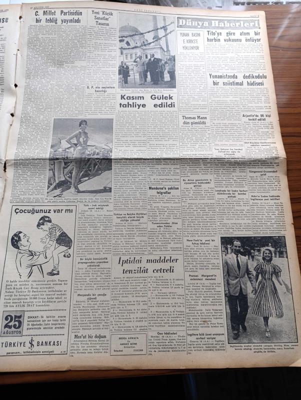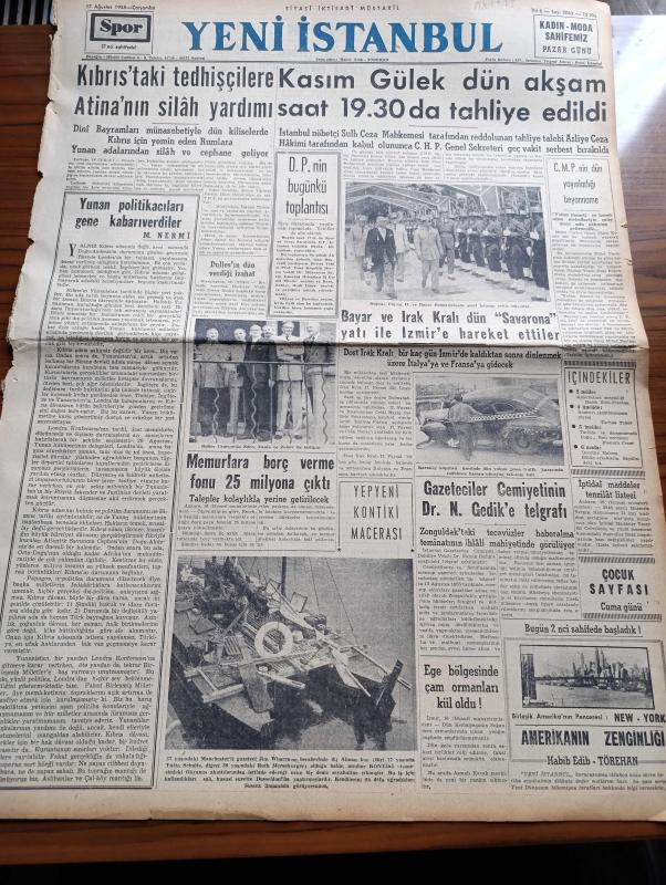 Yeni İstanbul Gazetesi - 17 Ağustos 1955 - Mustafa Nermi - Kıbrıs'taki Tedhişcilere Atina'nın Silah Yardımı - Kasım Gülek Dün Akşam Saat 19.30 da Tahliye Edildi - Celal Bayar Ve Irak Kralı İkinci Faysal Savarona Yatı İle İzmir'e Hareket Ettiler - Gazeteciler Cemiyetinin Namık Gedik'e Telgrafı - Mevcut Telefon Rehberi Halkı Zarara Sokuyor - Yenicami Hakkında İzahat Verilecek - Prenses Margaret'in Evlenme Meselesi - Bir Köylü Komünistlik Propagandası Yaparken Yakalandı - Ankara İstanbul İzmir Radyosu Programı - Tarhan Toker - Mustafa Cezar - Hasene Ilgaz - Ali Yağcıoğlu - Bütün Erkeklerin Hayalindeki Genç Kız Dorothy Malone - Yugoslavya Şampiyonu Mugosa Ekrem Koçak İle Tekrar Yarışmayı Kabul Ediyor - Fenerbahçe Hacettepe Maçı - Alman Milli Futbol Takımı Kaptanı Fritz Walter'in Turgay Şeren'e Mektubu - Gripin - Boğaziçi Güzelhisar Arsaları adlı eser, Kitap > Süreli Yayınlar > Gazeteler > Türkiye > Genel > Günlük kategorisinde İkinci El olarak satıştadır.