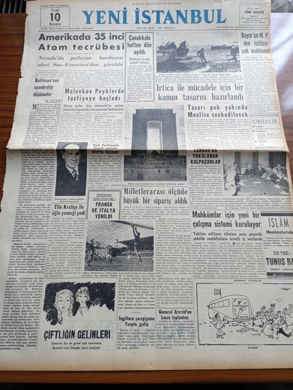 Yeni İstanbul Gazetesi - 18 Mart 1953 - Amerika'da 35. Atom Tecrübesi - Malenkov Peyklerde Tasfiyeye Başladı - Mareşal Tito Kraliçe Elizabeth İle Öğle Yemeği Yedi - Ordulararası Futbol Birinciliği Fransa Ve İtalya Yenildi - Bugün Temeli Atılacak Çanakkale Abidesinin Maketi - İrtica İle Mücadele İçin Bir Kanun Tasarısı Hazırlandı - Mahkumlar İçin Yeni Bir Çalışma Sistemi Kuruluyor - Hikmet Bayur'un Millet Partisi'nden İstifası Çok Muhtemel - Küçük İnsanlar Yazan Faik Baysal Yazı Dizisi - Büyük Kardeşim Atatürk Anlatan Makbule Atadan Yazı Dizisi - 1001 Gece Masalları Kamer Ül Zaman Çeviren Reşad Nuri Darago Yazı Dizisi - Akbank - Memleket Ve Dünya Borsa Ve Piyasaları - İstanbul Şehir Tiyatrosu Aleyhine Açılan Bir Dava- Lanetli Mahalle Yazan Mehmet Davaz Yazı Dizisi - Üniversitelerde Kızılay Şubeleri Açılıyor - Fenerbahçe Antrenörü Szeckelly - Güreş Federasyonu Reisi Vehbi Emre'nin Yeni Demeci - Grekoromenci Ali Özdemir - Arap Ansiklopedisi Hazırlığı - Türkiye İş Bankası - Dermojen adlı eser, Kitap > Süreli Yayınlar > Gazeteler > Türkiye > Genel > Günlük kategorisinde İkinci El olarak satıştadır.