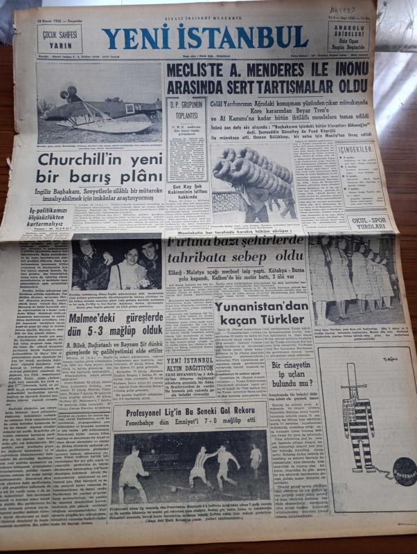 Yeni İstanbul Gazetesi - 19 Kasım 1953 - İç Politikamızı Ölçüsüzlükten Kurtarmalıyız Yazan Mustafa Nermi Köşe - Malmoe'lerdeki Güreşlerde Dün 5 3 Mağlup Olduk - Profesyonel Lig'in Bu Seneki Gol Rekoru Fenerbahçe Emniyeti 7 0 Mağlup Etti - Milliyetçi Çin'de Çan Kay Şek Kabinesinin İstifası Hakkında - Jenny Yazan Thedore Dreiser Yazı Dizisi - Kömür Taşıyan Kamyonlar Karaborsa İle İş Görüyor - Mecliste Adnan Menderes İle İsmet İnönü Arasındaki Sert Tartışmalar - Kral Faruk Gıyaben Muhakeme Edilecek - Mau Mau Lideri Amola Komard Türkiye'ye Gelmek İstiyor - Anadolu Abideleri Yazan Aziz Ogan Yazı Dizisi - Kızıl Kraliçe Yazan Jacques Renand Yazı Dizisi - İstanbul Ankara İzmir Teknik Üniversite Radyosu Programı - Küçük Hikaye Hayat Ve Ben Yazan Meliha Bahriye Şarlı - İtalyan Hakem Bella Yarın Geliyor, Habib Edib Törehan tarafından kaleme alınmıştır. Yeni İstanbul Gazetesi - 19 Kasım 1953 - İç Politikamızı Ölçüsüzlükten Kurtarmalıyız Yazan Mustafa Nermi Köşe - Malmoe'lerdeki Güreşlerde Dün 5 3 Mağlup Olduk - Profesyonel Lig'in Bu Seneki Gol Rekoru Fenerbahçe Emniyeti 7 0 Mağlup Etti - Milliyetçi Çin'de Çan Kay Şek Kabinesinin İstifası Hakkında - Jenny Yazan Thedore Dreiser Yazı Dizisi - Kömür Taşıyan Kamyonlar Karaborsa İle İş Görüyor - Mecliste Adnan Menderes İle İsmet İnönü Arasındaki Sert Tartışmalar - Kral Faruk Gıyaben Muhakeme Edilecek - Mau Mau Lideri Amola Komard Türkiye'ye Gelmek İstiyor - Anadolu Abideleri Yazan Aziz Ogan Yazı Dizisi - Kızıl Kraliçe Yazan Jacques Renand Yazı Dizisi - İstanbul Ankara İzmir Teknik Üniversite Radyosu Programı - Küçük Hikaye Hayat Ve Ben Yazan Meliha Bahriye Şarlı - İtalyan Hakem Bella Yarın Geliyor adlı eser Türkçe dilindedir.