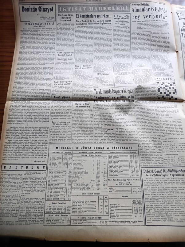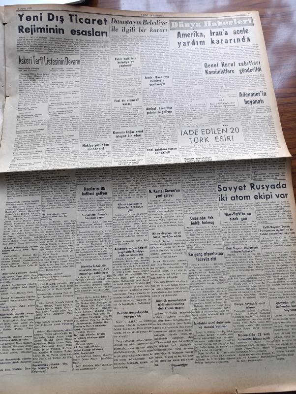 Yeni İstanbul Gazetesi - 2 Eylül 1953 - İran'da Kısımlar Tevkif Ediliyor - Yeni Bir İdare Teşkilatına Muhtacız Yazan Habib Edib Törehan Köşe Yazısı - Kabine Yeni Dış Ticaret Kararnamesini Görüştü - Fransız Başbakanı Joseph Laniel 1 Ekim'de Geliyor - John Foster Dulles'ın Beyanatı - Güzellik Müsabakası Bu Akşam Başlıyor - İsveç Güzelinin Enteresan Pozu - Milyonluk Yatın Sahibi Onasis'le Konuştuk - Seçim Tarihi Henüz Kati Olarak Tesbit Edilmedi - 10 Kasım'da Atatürk'ün Naşı Anıtkabir'e Naklediliyor - Millet Partisi Hakkında Ayrı İki Dava Mı Açılacak - Futbolcu Bülent Eken İtalya'dan Döndü - Halide Edip Adıvar'ın Romanı Döner Ayna Yazı Dizisi - Türkiye'nin En Büyük Asabiye Kliniği Cumartesi Günü Açılıyor - Şehir Tiyatroları Rejisörü Değişmiyor - Amerika İran'a Acil Yardım Kararında - Irak Kralı Faysal Hükümetin İstifasını Kabul Etti - Denizdeki Cinayet Telif Hakkı Keystone Yazı Dizisi - Ankara İstanbul İzmir Radyosu Programı - Anadolu Abidelerinde Yazan Aziz Ogan Yazı Dizisi, Habib Edib Törehan tarafından kaleme alınmıştır. Yeni İstanbul Gazetesi - 2 Eylül 1953 - İran'da Kısımlar Tevkif Ediliyor - Yeni Bir İdare Teşkilatına Muhtacız Yazan Habib Edib Törehan Köşe Yazısı - Kabine Yeni Dış Ticaret Kararnamesini Görüştü - Fransız Başbakanı Joseph Laniel 1 Ekim'de Geliyor - John Foster Dulles'ın Beyanatı - Güzellik Müsabakası Bu Akşam Başlıyor - İsveç Güzelinin Enteresan Pozu - Milyonluk Yatın Sahibi Onasis'le Konuştuk - Seçim Tarihi Henüz Kati Olarak Tesbit Edilmedi - 10 Kasım'da Atatürk'ün Naşı Anıtkabir'e Naklediliyor - Millet Partisi Hakkında Ayrı İki Dava Mı Açılacak - Futbolcu Bülent Eken İtalya'dan Döndü - Halide Edip Adıvar'ın Romanı Döner Ayna Yazı Dizisi - Türkiye'nin En Büyük Asabiye Kliniği Cumartesi Günü Açılıyor - Şehir Tiyatroları Rejisörü Değişmiyor - Amerika İran'a Acil Yardım Kararında - Irak Kralı Faysal Hükümetin İstifasını Kabul Etti - Denizdeki Cinayet Telif Hakkı Keystone Yazı Dizisi - Ankara İstanbul İzmir Radyosu Programı - Anadolu Abidelerinde Yazan Aziz Ogan Yazı Dizisi adlı eser Türkçe dilindedir.