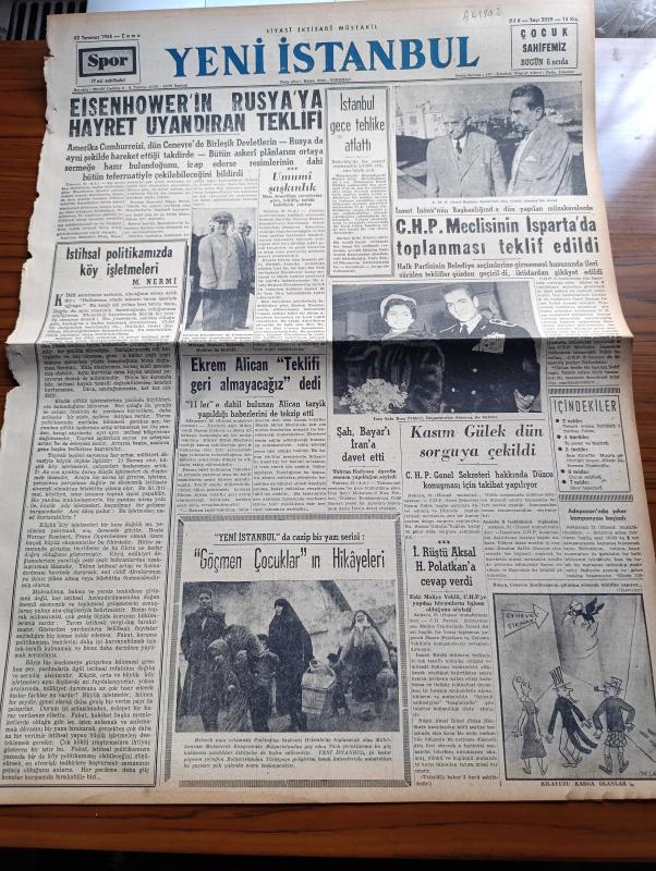 Yeni İstanbul Gazetesi - 22 Temmuz 1955 - Mustafa Nermi - Eisenhower'in Rusya'ya Hayret Uyandıran Teklifi - Bakırköy'de Askeri Cephanelik İnfilak Etti - 11'lere Dahil Olan Ekrem Alican Teklifi Geri Almayacağız Dedi - İsmail Rüştü Aksal Hasan Polatkan'a Cevap Verdi - Kasım Gülek Dün Sorguya Çekildi - Şah Celal Bayar'ı İran'a Davet Etti - CHP Genel Başkanı İsmet İnönü - Huzur Hasreti Yazan Mehmet Davaz Yazı Dizisi - Samed Ağaoğlu'nun Radyodaki Konuşması - Denizcilik Bankası 9 Yeni Gemi Siparişi Verdi - Yüksek Askeri Hemşire Okulu - Ankara İstanbul İzmir Radyosu Programı - Mehtap Şarkısı Cinayetleri Yazan Francis Didelot Yazı Dizisi - Milletlerarası Kalay Konferansı Müzakereleri - Şair Eşrefin Mısır'a Götürdüğü Koçan - Viyana Opera Festivali - Tekerlekli Saray - Çocuk Sayfası - Barselona'da 1500 Metrede Ekrem Koçak Birinci Oldu - Mehmet Ali Has Kardeşi Şeref'i Yanına Alarak Fenerbahçe'ye Döndü - Galatasaray'ın Fenerbahçe'ye Vereceği Kupa - Yunan Güzeli Sonia Fenerbahçe'yi Seviyor, Habib Edib Törehan tarafından kaleme alınmıştır. Yeni İstanbul Gazetesi - 22 Temmuz 1955 - Mustafa Nermi - Eisenhower'in Rusya'ya Hayret Uyandıran Teklifi - Bakırköy'de Askeri Cephanelik İnfilak Etti - 11'lere Dahil Olan Ekrem Alican Teklifi Geri Almayacağız Dedi - İsmail Rüştü Aksal Hasan Polatkan'a Cevap Verdi - Kasım Gülek Dün Sorguya Çekildi - Şah Celal Bayar'ı İran'a Davet Etti - CHP Genel Başkanı İsmet İnönü - Huzur Hasreti Yazan Mehmet Davaz Yazı Dizisi - Samed Ağaoğlu'nun Radyodaki Konuşması - Denizcilik Bankası 9 Yeni Gemi Siparişi Verdi - Yüksek Askeri Hemşire Okulu - Ankara İstanbul İzmir Radyosu Programı - Mehtap Şarkısı Cinayetleri Yazan Francis Didelot Yazı Dizisi - Milletlerarası Kalay Konferansı Müzakereleri - Şair Eşrefin Mısır'a Götürdüğü Koçan - Viyana Opera Festivali - Tekerlekli Saray - Çocuk Sayfası - Barselona'da 1500 Metrede Ekrem Koçak Birinci Oldu - Mehmet Ali Has Kardeşi Şeref'i Yanına Alarak Fenerbahçe'ye Döndü - Galatasaray'ın Fenerbahçe'ye Vereceği Kupa - Yunan Güzeli Sonia Fenerbahçe'yi Seviyor adlı eser Türkçe dilindedir.