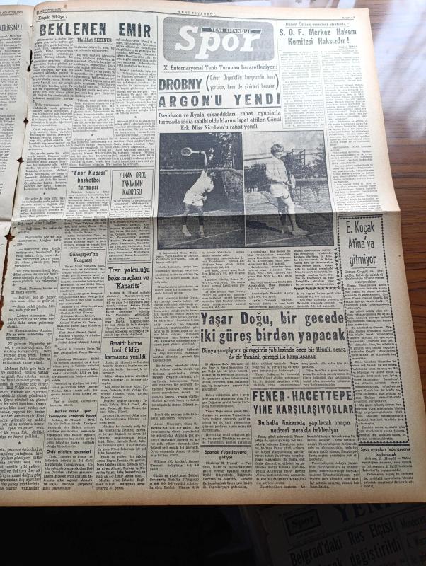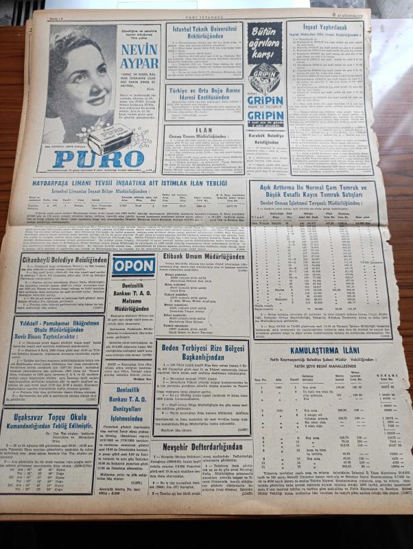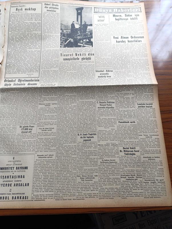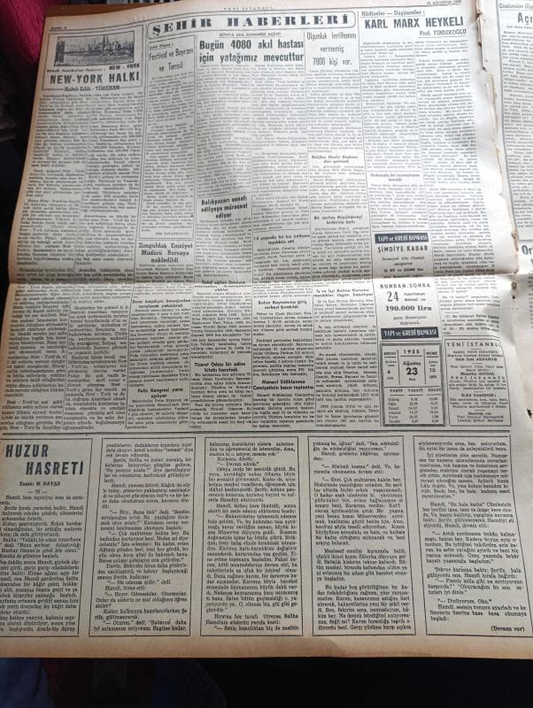 Yeni İstanbul Gazetesi - 23 Ağustos 1955 - Mustafa Nermi - Cezayirde Dokuz Köy Dinamitle Uçuruldu - Başvekil Adnan Menderes - Amerika'da Türk Tepsisi - Celal Bayar Dost İran'ı Ziyaret Etti - Ticaret Vekili Sıtkı Yırcalı - Yüksek Askeri Şura - Dünya Akıl Kongresi Açıldı - Balıkpazarı Esnafı Adliyeye Müracaat Ediyor - Bahar Bayramına Giriş Serbest Bırakıldı - İzmir Fuarı - Yeni Alman Ordusunun Kuruluş Hazırlıkları - Pamukbank Açıldı - Ankara İstanbul İzmir Radyosu - Amerika'da Bisiklet Fiyatları Yükseldi - Cevdet Türkay - Günün Tarihi Sakarya Meydan Muharebesi - Marmara Adasında Bir Kaç Gün - Bağcılar Bayramı - Yaşar Doğu Bir Gecede İki Güreş Birden Yapacak - Fenerbahçe Hacettepe Yine Karşılaşıyorlar - Fuar Kupası Basketbol Turnuvası - Güneşspor'un Kongresi - Gripin - Film Yıldızı Nevin Aypar Puro Tuvalet Sabunları Kullanıyorum Diyor, Habib Edib Törehan tarafından kaleme alınmıştır. Yeni İstanbul Gazetesi - 23 Ağustos 1955 - Mustafa Nermi - Cezayirde Dokuz Köy Dinamitle Uçuruldu - Başvekil Adnan Menderes - Amerika'da Türk Tepsisi - Celal Bayar Dost İran'ı Ziyaret Etti - Ticaret Vekili Sıtkı Yırcalı - Yüksek Askeri Şura - Dünya Akıl Kongresi Açıldı - Balıkpazarı Esnafı Adliyeye Müracaat Ediyor - Bahar Bayramına Giriş Serbest Bırakıldı - İzmir Fuarı - Yeni Alman Ordusunun Kuruluş Hazırlıkları - Pamukbank Açıldı - Ankara İstanbul İzmir Radyosu - Amerika'da Bisiklet Fiyatları Yükseldi - Cevdet Türkay - Günün Tarihi Sakarya Meydan Muharebesi - Marmara Adasında Bir Kaç Gün - Bağcılar Bayramı - Yaşar Doğu Bir Gecede İki Güreş Birden Yapacak - Fenerbahçe Hacettepe Yine Karşılaşıyorlar - Fuar Kupası Basketbol Turnuvası - Güneşspor'un Kongresi - Gripin - Film Yıldızı Nevin Aypar Puro Tuvalet Sabunları Kullanıyorum Diyor adlı eser Türkçe dilindedir.