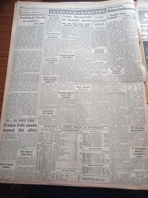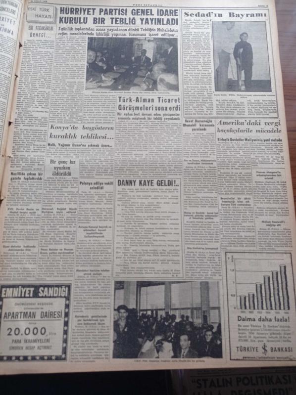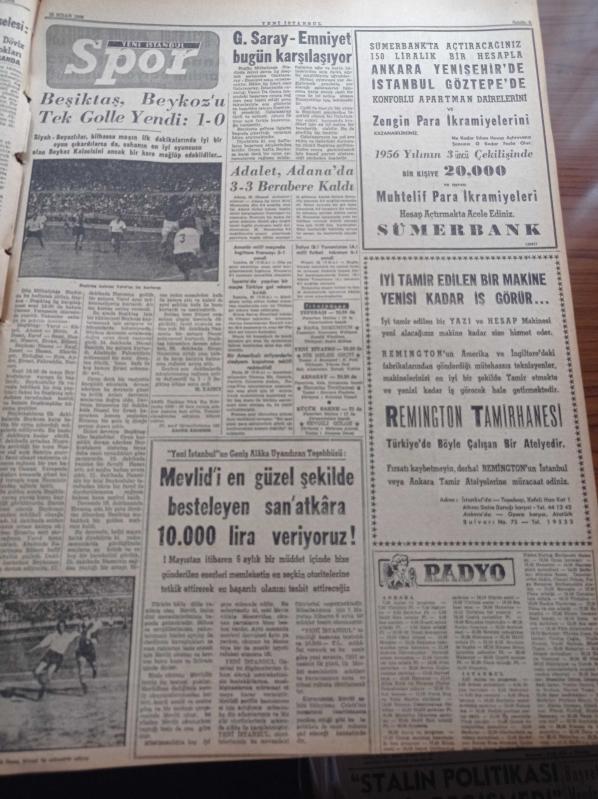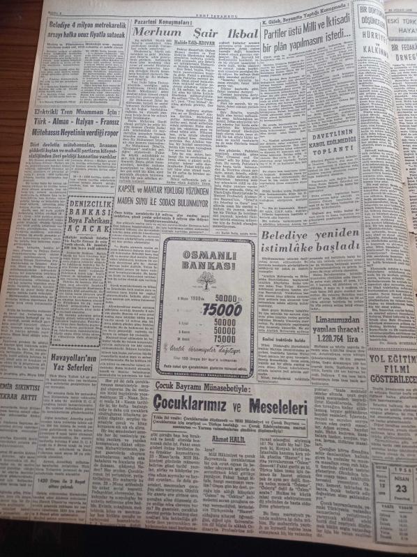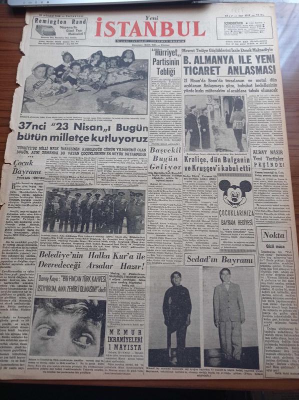 Yeni İstanbul Gazetesi - 23 Nisan 1956 - 37nci 23 Nisan'ı Bugün Bütün Milletçe Kutluyoruz - Danny Kaye Bir Fincan Türk Kahvesi İstiyorum Ama Zehirli Olmasın Dedi- Başvekil Adnan Menderes Bugün Geliyor - Kraliçe Dün Bulganin Ve Kruşçev'i Kabul Etti - Federal Almanya İle İlgili Yeni Ticaret Anlaşması - Merhum Şair İkbal - Halide Edip Adıvar - Elektrikli Tren Muamması - Kasım Gülek Beyazıt Konuşması - Cevat Dursunoğlu Otomobil Kazasında Yaralandı - Nureddin Baransel Büyük Elçiliğine Tayin Edilecek - Anadolu'da Büyük Su Tesisleri - Almanya'nın Jeep Siparişi - Beşiktaş Beykoz'u Tek Golle Yendi - Galatasaray Emniyet Bugün Karşılaşıyor - Sümerbank - Remington - Mithatpaşa Stadi adlı eser Türkçe dilindedir.