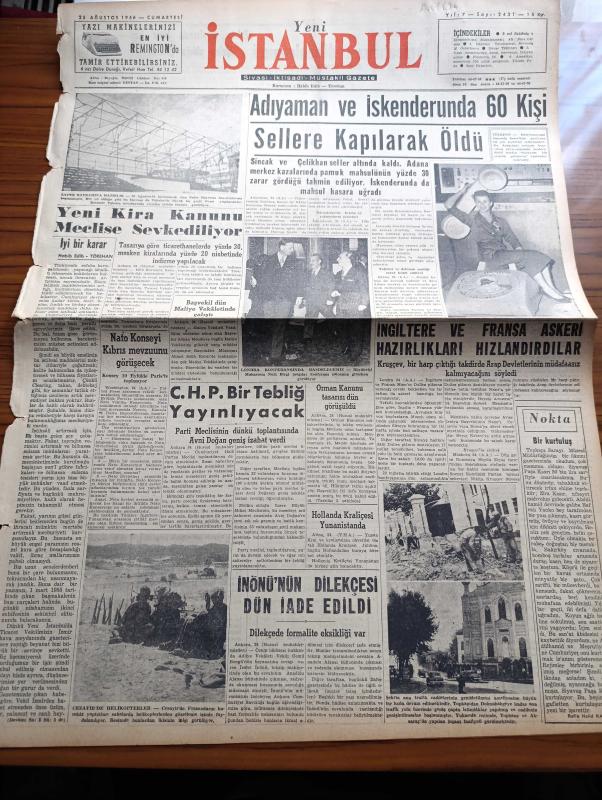 Yeni İstanbul Gazetesi - 25 Ağustos 1956 - Refik Halid Karay - Adıyaman Ve İskenderun 60 Kişi Sellere Kapılarak Öldü - NATO Konseyi Kıbrıs Mevzuunu Görüşecek - İsmet İnönü'nün Dilekçesi Dün İade Edildi - İngiltere ve Fransa Askeri Hazırlıkları Hızlandırdılar - Çifte Oyun Yazan Colette Yazı Dizisi - Şarkıcı Zeki Müren'e Usulsüz Verilen Vesika - Hilton'da Hırsızlık - Beş Cezayirli Milliyetçi Giyotinle İdam Edilecek - Vahşi Hayvanlar Hipnotize Ediliyor - Ali Nuri Okday - EOKA - İstanbul Üniversitesi - Yugoslavya'da Rus Otomobilleri - Macera Peşinde Çeviren İhsan Aysu Yazı Dizisi - Ankara İstanbul Radyosu Programı - Tan Sineması - Alkazar Sineması - İstanbul Enternasyonal Tenis Turnuvası - Forbes Vermaak Çifti Patty Fancutt Çiftini Mağlup Ettiler - İzmir Enternasyonal Fuarı - Prenses Margaret - 19 Mayıs Stadyumundaki İnşaat 29 Ekim'de İkmal Edilmiş Olacak, Habib Edib Törehan tarafından kaleme alınmıştır. Yeni İstanbul Gazetesi - 25 Ağustos 1956 - Refik Halid Karay - Adıyaman Ve İskenderun 60 Kişi Sellere Kapılarak Öldü - NATO Konseyi Kıbrıs Mevzuunu Görüşecek - İsmet İnönü'nün Dilekçesi Dün İade Edildi - İngiltere ve Fransa Askeri Hazırlıkları Hızlandırdılar - Çifte Oyun Yazan Colette Yazı Dizisi - Şarkıcı Zeki Müren'e Usulsüz Verilen Vesika - Hilton'da Hırsızlık - Beş Cezayirli Milliyetçi Giyotinle İdam Edilecek - Vahşi Hayvanlar Hipnotize Ediliyor - Ali Nuri Okday - EOKA - İstanbul Üniversitesi - Yugoslavya'da Rus Otomobilleri - Macera Peşinde Çeviren İhsan Aysu Yazı Dizisi - Ankara İstanbul Radyosu Programı - Tan Sineması - Alkazar Sineması - İstanbul Enternasyonal Tenis Turnuvası - Forbes Vermaak Çifti Patty Fancutt Çiftini Mağlup Ettiler - İzmir Enternasyonal Fuarı - Prenses Margaret - 19 Mayıs Stadyumundaki İnşaat 29 Ekim'de İkmal Edilmiş Olacak adlı eser Türkçe dilindedir.