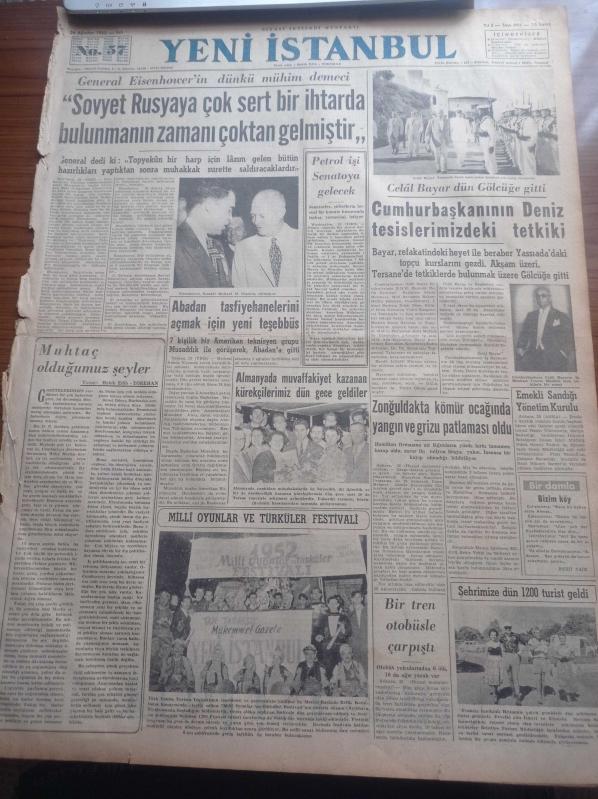 Yeni İstanbul Gazetesi - 26 Ağustos 1952 - General Eisenhower Sovyet Rusya'ya Çok Sert Bir İhtarda Bulunmanın Zamanı Çoktan Gelmiştir Dedi - Almanya'da Muvaffakiyet Kazanan Kürekçilerimiz Dün Gece Geldiler - Cumhurbaşkanı Celal Bayar Yassıada'daki Topçu Kurslarını Gezdi - Milli Oyunlar ve Türküler Festivali - Zonguldak'ta Kömür Ocağında Yangın Ve Grizu Patlaması Oldu - Esir Şehrin İnsanları Yazan Nureddin Demir (Kemal Tahir) Yazı Dizisi - Hamasi Resim Sergisi - Ortadoğu'da Komünizme Karşı Teşkilat Kurulması İsteniyor - Eskişehir Şeker Fabrikası Pancar Kampanyası Başladı - İş Bankası 28 Yaşında - Trabzon Limanı Gelecek Yıl Tamamlanmış Olacak - Büyük Sanatkar Antonio Gaudi'nin Garip Mimarisi - İstanbul'da İlk Konkurhipik 1910 Yılında Yapıldı - Yeni Bir İlaç Keşfedildi - Ortadoğu'da Kadının Mevkii - Birbirine Benzeyen Meşhurlar - Kraliçe Elizabeth - Corona Dikiş Nakış Makineleri - Hoover Elektrik Süpürgesi - Dizel Leyland - Türkiye Münhasır İthalatçısı Mehmet Kavala, Habib Edib Törehan tarafından kaleme alınmıştır. Yeni İstanbul Gazetesi - 26 Ağustos 1952 - General Eisenhower Sovyet Rusya'ya Çok Sert Bir İhtarda Bulunmanın Zamanı Çoktan Gelmiştir Dedi - Almanya'da Muvaffakiyet Kazanan Kürekçilerimiz Dün Gece Geldiler - Cumhurbaşkanı Celal Bayar Yassıada'daki Topçu Kurslarını Gezdi - Milli Oyunlar ve Türküler Festivali - Zonguldak'ta Kömür Ocağında Yangın Ve Grizu Patlaması Oldu - Esir Şehrin İnsanları Yazan Nureddin Demir (Kemal Tahir) Yazı Dizisi - Hamasi Resim Sergisi - Ortadoğu'da Komünizme Karşı Teşkilat Kurulması İsteniyor - Eskişehir Şeker Fabrikası Pancar Kampanyası Başladı - İş Bankası 28 Yaşında - Trabzon Limanı Gelecek Yıl Tamamlanmış Olacak - Büyük Sanatkar Antonio Gaudi'nin Garip Mimarisi - İstanbul'da İlk Konkurhipik 1910 Yılında Yapıldı - Yeni Bir İlaç Keşfedildi - Ortadoğu'da Kadının Mevkii - Birbirine Benzeyen Meşhurlar - Kraliçe Elizabeth - Corona Dikiş Nakış Makineleri - Hoover Elektrik Süpürgesi - Dizel Leyland - Türkiye Münhasır İthalatçısı Mehmet Kavala adlı eser Türkçe dilindedir.
