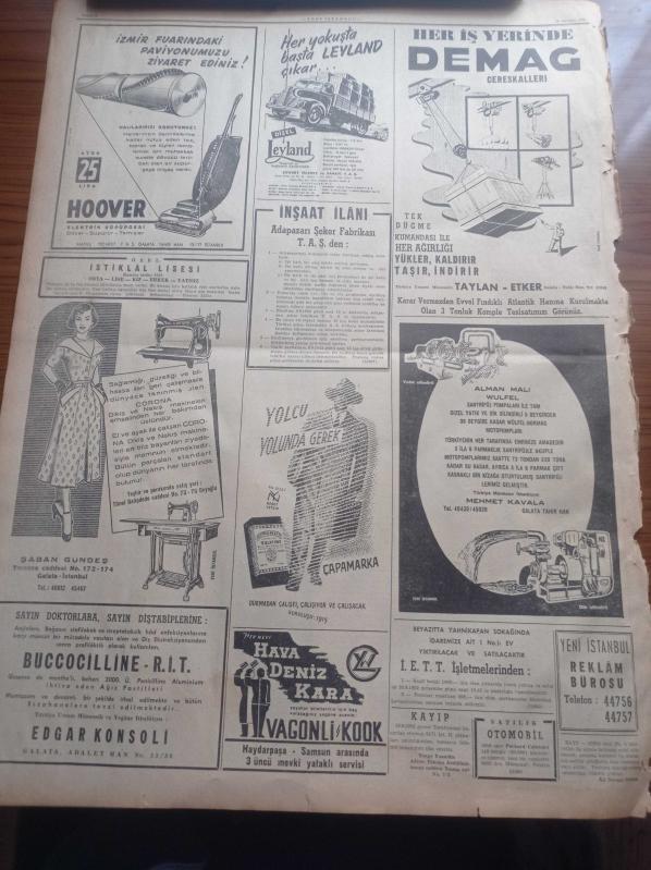 Yeni İstanbul Gazetesi - 26 Ağustos 1952 - General Eisenhower Sovyet Rusya'ya Çok Sert Bir İhtarda Bulunmanın Zamanı Çoktan Gelmiştir Dedi - Almanya'da Muvaffakiyet Kazanan Kürekçilerimiz Dün Gece Geldiler - Cumhurbaşkanı Celal Bayar Yassıada'daki Topçu Kurslarını Gezdi - Milli Oyunlar ve Türküler Festivali - Zonguldak'ta Kömür Ocağında Yangın Ve Grizu Patlaması Oldu - Esir Şehrin İnsanları Yazan Nureddin Demir (Kemal Tahir) Yazı Dizisi - Hamasi Resim Sergisi - Ortadoğu'da Komünizme Karşı Teşkilat Kurulması İsteniyor - Eskişehir Şeker Fabrikası Pancar Kampanyası Başladı - İş Bankası 28 Yaşında - Trabzon Limanı Gelecek Yıl Tamamlanmış Olacak - Büyük Sanatkar Antonio Gaudi'nin Garip Mimarisi - İstanbul'da İlk Konkurhipik 1910 Yılında Yapıldı - Yeni Bir İlaç Keşfedildi - Ortadoğu'da Kadının Mevkii - Birbirine Benzeyen Meşhurlar - Kraliçe Elizabeth - Corona Dikiş Nakış Makineleri - Hoover Elektrik Süpürgesi - Dizel Leyland - Türkiye Münhasır İthalatçısı Mehmet Kavala adlı eser, Kitap > Süreli Yayınlar > Gazeteler > Türkiye > Genel > Günlük kategorisinde İkinci El olarak satıştadır.