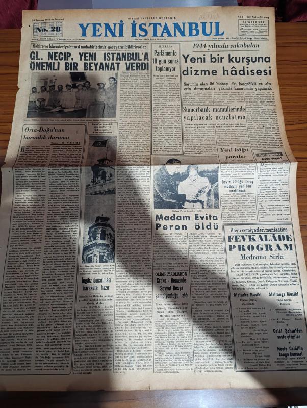 Yeni İstanbul Gazetesi - 28 Temmuz 1952 - Mustafa Nermi - General Necip yeni İstanbul'a önemli bir beyanat verdi- 1944 yılında vuku bulan yeni bir kurşuna dizme hadisesi- Sümerbank mamüllerinde yapılacak ucuzlatma- Mısır'da parlamento 10 gün sonra toplanıyor- Madam Evita Peron öldü- Yeni kağıt paralar- Olimpiyatlarda grekoromen'de Sovyet Rusya şampiyonluğu aldı- Medrano sirki- Esir Şehrin İnsanları Nurettin Demir (Kemal Tahir) yazı dizisi - kadın ve çarşaf - büyük bir Amerikan filosu Şehrimize geliyor- Mısır'da hanedana ait saraylara Ordu el koydu - Paris'in büyük sokaklarından birine Ankara adı veriliyor- Yeni İstanbul 1952 Helsinki olimpiyatında- Memleketimizde ayakkabı sanayisinin durumu - Piyasalarda haftalık vaziyet- Volvo- Fendt Dieselross Traktörleri - Mısır hadisesinden fotoğraflar - Kral Faruk Mısırı nasıl terk etti- Orta doğu'nun karanlık durumu- Doğu Akdeniz'de tehlikeli bir cisim yüzüyor- savcı ve yargıçlar arasında yapılan tayin ve nakiller- Amerika'da Çelik sanayi grevi, Habib Edib Törehan tarafından kaleme alınmıştır. Yeni İstanbul Gazetesi - 28 Temmuz 1952 - Mustafa Nermi - General Necip yeni İstanbul'a önemli bir beyanat verdi- 1944 yılında vuku bulan yeni bir kurşuna dizme hadisesi- Sümerbank mamüllerinde yapılacak ucuzlatma- Mısır'da parlamento 10 gün sonra toplanıyor- Madam Evita Peron öldü- Yeni kağıt paralar- Olimpiyatlarda grekoromen'de Sovyet Rusya şampiyonluğu aldı- Medrano sirki- Esir Şehrin İnsanları Nurettin Demir (Kemal Tahir) yazı dizisi - kadın ve çarşaf - büyük bir Amerikan filosu Şehrimize geliyor- Mısır'da hanedana ait saraylara Ordu el koydu - Paris'in büyük sokaklarından birine Ankara adı veriliyor- Yeni İstanbul 1952 Helsinki olimpiyatında- Memleketimizde ayakkabı sanayisinin durumu - Piyasalarda haftalık vaziyet- Volvo- Fendt Dieselross Traktörleri - Mısır hadisesinden fotoğraflar - Kral Faruk Mısırı nasıl terk etti- Orta doğu'nun karanlık durumu- Doğu Akdeniz'de tehlikeli bir cisim yüzüyor- savcı ve yargıçlar arasında yapılan tayin ve nakiller- Amerika'da Çelik sanayi grevi adlı eser Türkçe dilindedir.
