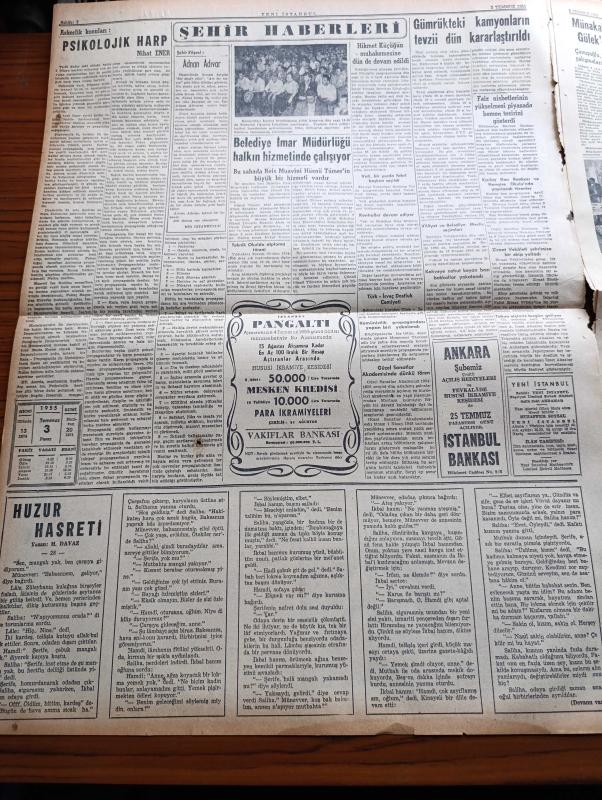 Yeni İstanbul Gazetesi - 3 Temmuz 1955 - Mustafa Nermi - Yaz Yağmuru Yazan Ahmet Hamdi Tanpınar Yazı Dizisi - İlim Ve Siyaset Adamı Adnan Adıvar'ın Cenazesi Dün Törenle Kaldırıldı - Ortadoğu Paktı Daimi Konseyi - İngiltere'nin Kıbrıs İçin Üçlü Bir Konferans Teklifini Kabul Ettik - Muammer Çavuşoğlu Kasım Gülek'in İddialarını Dün Cevaplandırdı - Celal Bayar Ve Irak Kralı İkinci Faysal Bugün İstanbul'a Geliyor - Psikolojik Harp - Huzur Hasreti Yazan Mehmet Davaz Yazı Dizisi - Amerika Vize Kolaylıkları Gösteriyor - Ankara Istanbul İzmir Radyosu Programı - Mehtap Şarkısı Cinayetler Yazan Francis Didelot Yazı Dizisi - Baydar Derler Pazar Konuşmaları - Prens Charles Ve Prenses Anne'ın Yeni Ata Binme Hocası - Gülnüş Valde Sultanın Damad İbrahim Paşaya Mektubu - Hikaye Kırmızı Eldiven Yazan Behice Yücedağ - Üniversite Ve Yüksek Okullar Basketbol Şampiyonası - Osman Coşgül 30.54 İle Barselona Barajını Aştı - Karagümrük Bugün Adana Demirspor'la Karşılaşıyor - Gripin - Çapamarka - Opon adlı eser, Kitap > Süreli Yayınlar > Gazeteler > Türkiye > Genel > Günlük kategorisinde İkinci El olarak satıştadır.