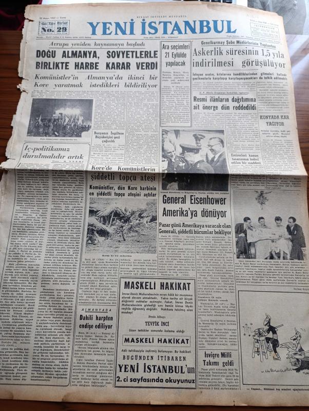 Yeni İstanbul Gazetesi - 30 Mayıs 1952 - Mustafa Nermi - Doğu Almanya Sovyetlere Birlikte Harbe Karar Verdi - Kore'de Komünistlerin Şiddetli Topçu Ateşi - Ara Seçimler 21 Eylül'de Yapılacak - General Eisenhower Amerika'ya Dönüyor - Rusya'nın İngiltere Büyükelçisi Geri Çağırıldı - Askerlik Süresinin 1,5 Yıla İndirilmesi Görüşülüyor - İsviçre Milli Takımı Geldi - İnkılap Partisi Muhakkak Kurulacak - Maskeli Hakikat 1 Yazan Deniz Albayı Tevfik İnci Yazı Dizisi - İstanbul'un 499. Fetih Yılı Münasebetiyle Mevlid Okundu - İstanbul Şehir Tiyatrosu Turneye Çıkıyor - Bedii Faik - İsmet İnönü İzmir'de Bekleniyor - Fransa'da Çıkan Komünist Gazeteleri Toplattırıldı - Kıbrıs Piskoposu Makarius Suriye'de - Tunceli Köprüsü Törenle Açıldı - Rakı İmali Serbest Bırakılıyor - Bitlis Bölgesinde Çekirge Görüldü - Yeni İstanbul Gazetesi Himalaya'da - Avrupa'nın En Tehlikeli Adamı Skorzeny Anlatıyor Mussolini'yi Nasıl Kaçırdım Yazı Dizisi - Roja Briyantin - Selve Dizel Motorları - Mediator Radyo, Habib Edib Törehan tarafından kaleme alınmıştır. Yeni İstanbul Gazetesi - 30 Mayıs 1952 - Mustafa Nermi - Doğu Almanya Sovyetlere Birlikte Harbe Karar Verdi - Kore'de Komünistlerin Şiddetli Topçu Ateşi - Ara Seçimler 21 Eylül'de Yapılacak - General Eisenhower Amerika'ya Dönüyor - Rusya'nın İngiltere Büyükelçisi Geri Çağırıldı - Askerlik Süresinin 1,5 Yıla İndirilmesi Görüşülüyor - İsviçre Milli Takımı Geldi - İnkılap Partisi Muhakkak Kurulacak - Maskeli Hakikat 1 Yazan Deniz Albayı Tevfik İnci Yazı Dizisi - İstanbul'un 499. Fetih Yılı Münasebetiyle Mevlid Okundu - İstanbul Şehir Tiyatrosu Turneye Çıkıyor - Bedii Faik - İsmet İnönü İzmir'de Bekleniyor - Fransa'da Çıkan Komünist Gazeteleri Toplattırıldı - Kıbrıs Piskoposu Makarius Suriye'de - Tunceli Köprüsü Törenle Açıldı - Rakı İmali Serbest Bırakılıyor - Bitlis Bölgesinde Çekirge Görüldü - Yeni İstanbul Gazetesi Himalaya'da - Avrupa'nın En Tehlikeli Adamı Skorzeny Anlatıyor Mussolini'yi Nasıl Kaçırdım Yazı Dizisi - Roja Briyantin - Selve Dizel Motorları - Mediator Radyo adlı eser Türkçe dilindedir.